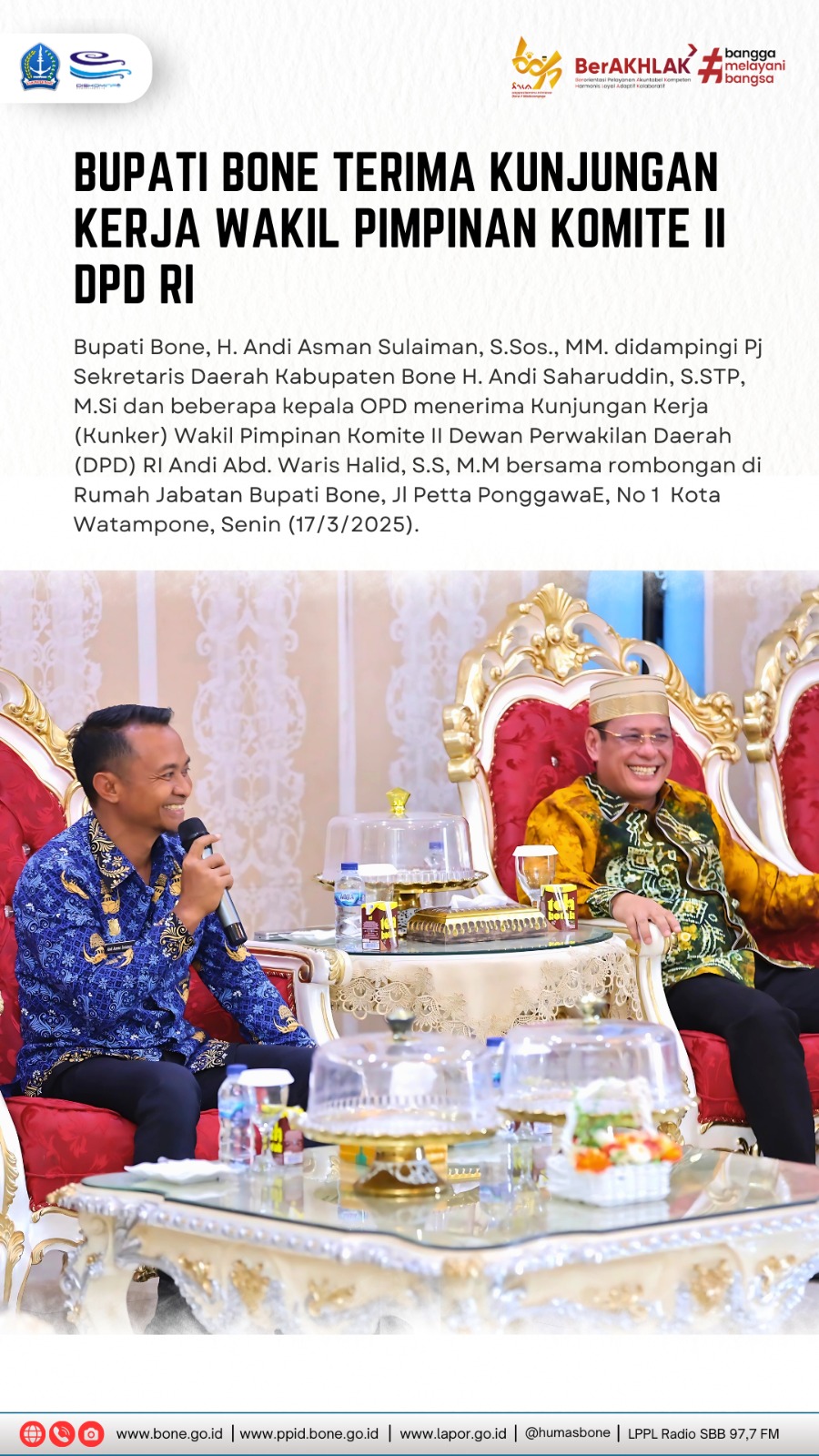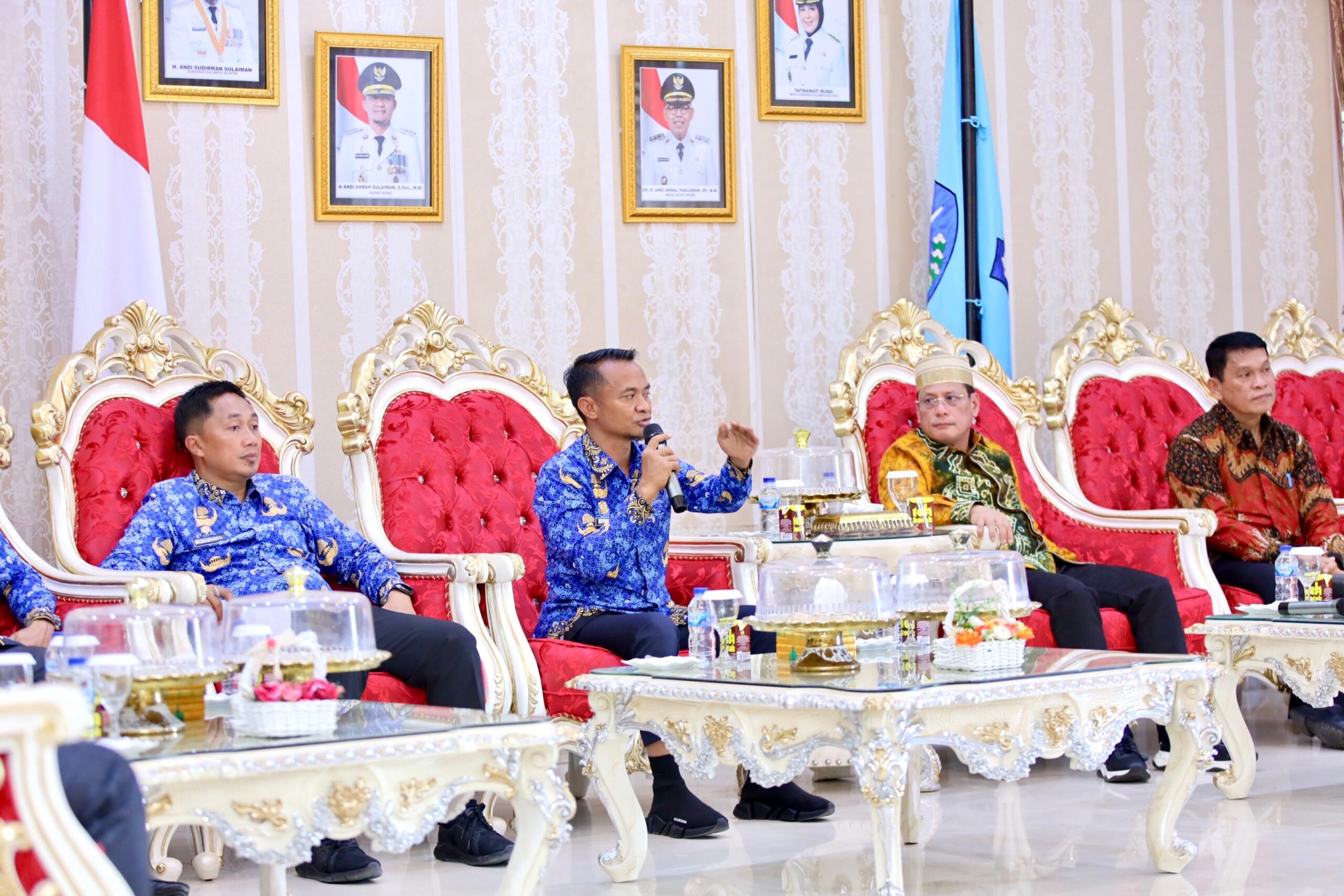 HumasBone – Bupati Bone Andi Asman Sulaiman, S.Sos., M.Si, menerima kunjungan kerja Wakil Ketua Komite II DPD RI Andi Abd Waris Halid, S.S., M.M.