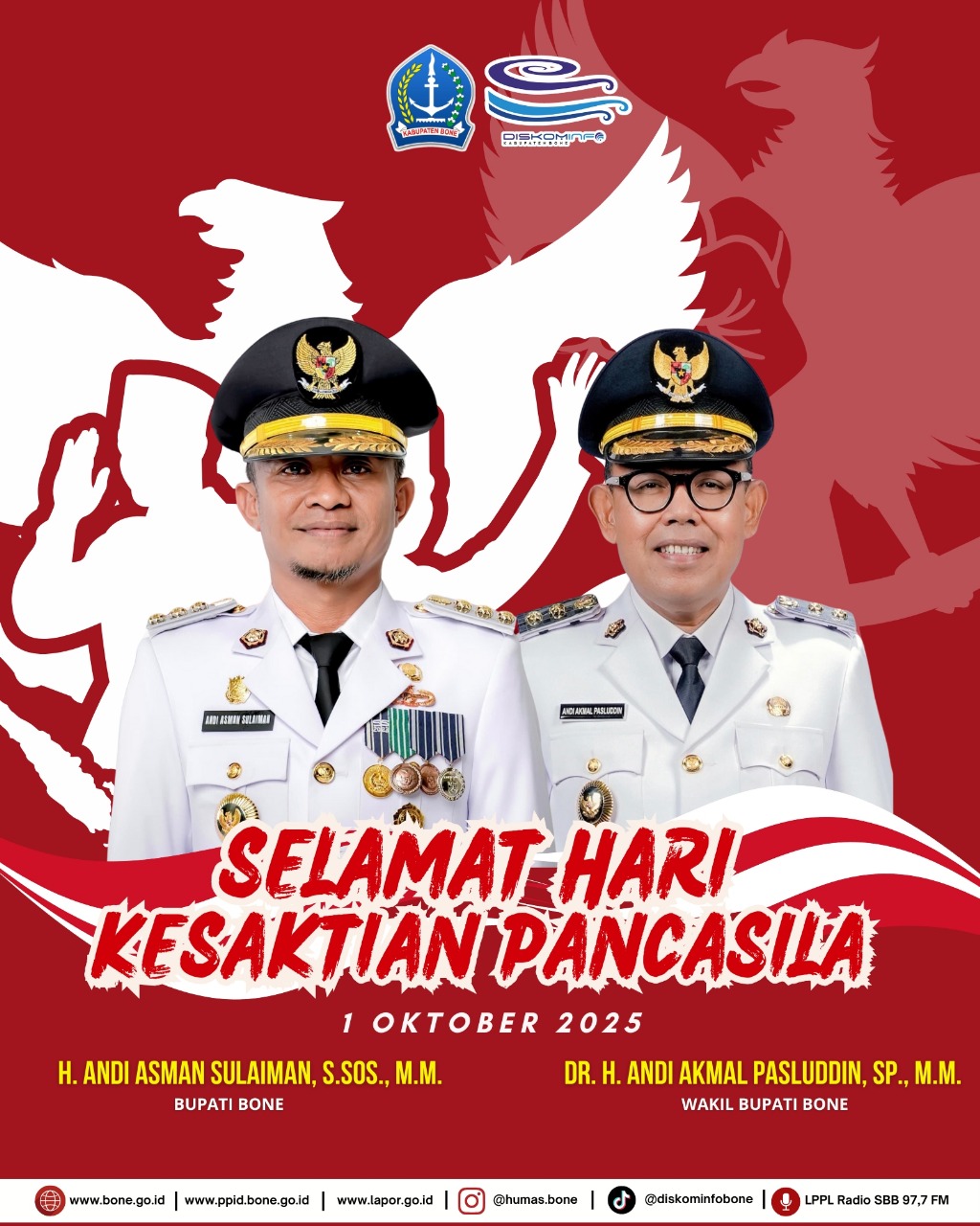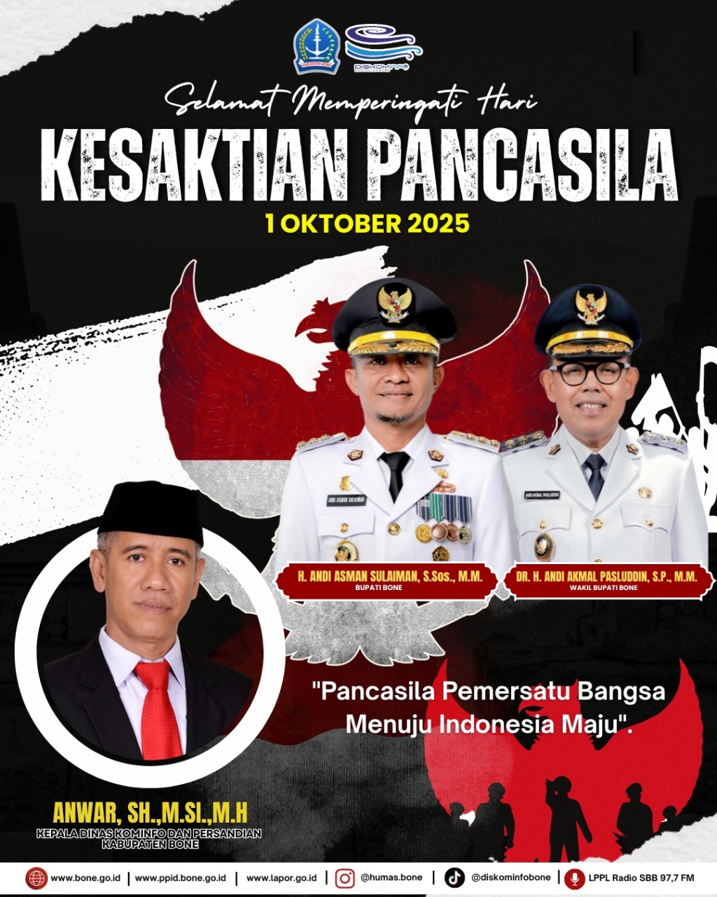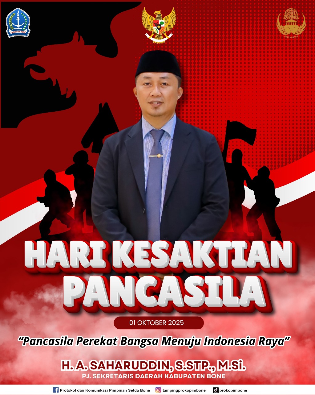 HumasBone – Pemerintah Kabupaten Bone mengucapkan selamat memperingati Hari Kesaktian Pancasila, 1 Oktober 2025. Semoga semangat Pancasila terus menjadi landasan dalam membangun bangsa dan negara yang lebih baik.