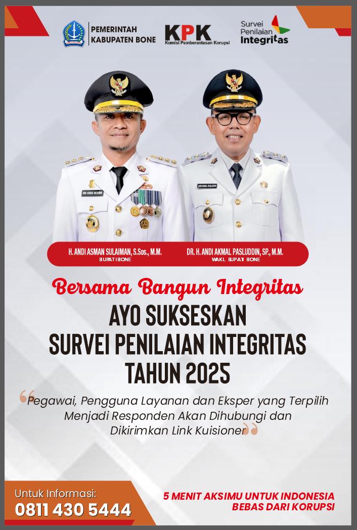 Bersama Bapak Bupati Bone H. A. Asman Sulaiman, S. Sos., MM dan Bapak Wakil Bupati Bone DR. H. A. Akmal Pasluddin, SP., MM, Ayo Jadi Pahlawan Integritas, Berani Mengisi, Habisi Korupsi! untuk mewujudkan pelayanan publik yang berintegritas!