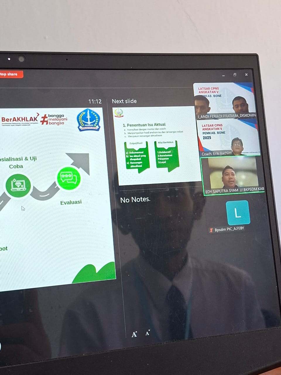 Pada Kamis, 16 Oktober 2025, peserta Latsar melakukan evaluasi rancangan aktualisasi sebagai bagian dari proses pembelajaran. Evaluasi ini bertujuan untuk menilai kemampuan peserta dalam merancang dan mengimplementasikan program-program yang bermanfaat bagi masyarakat.