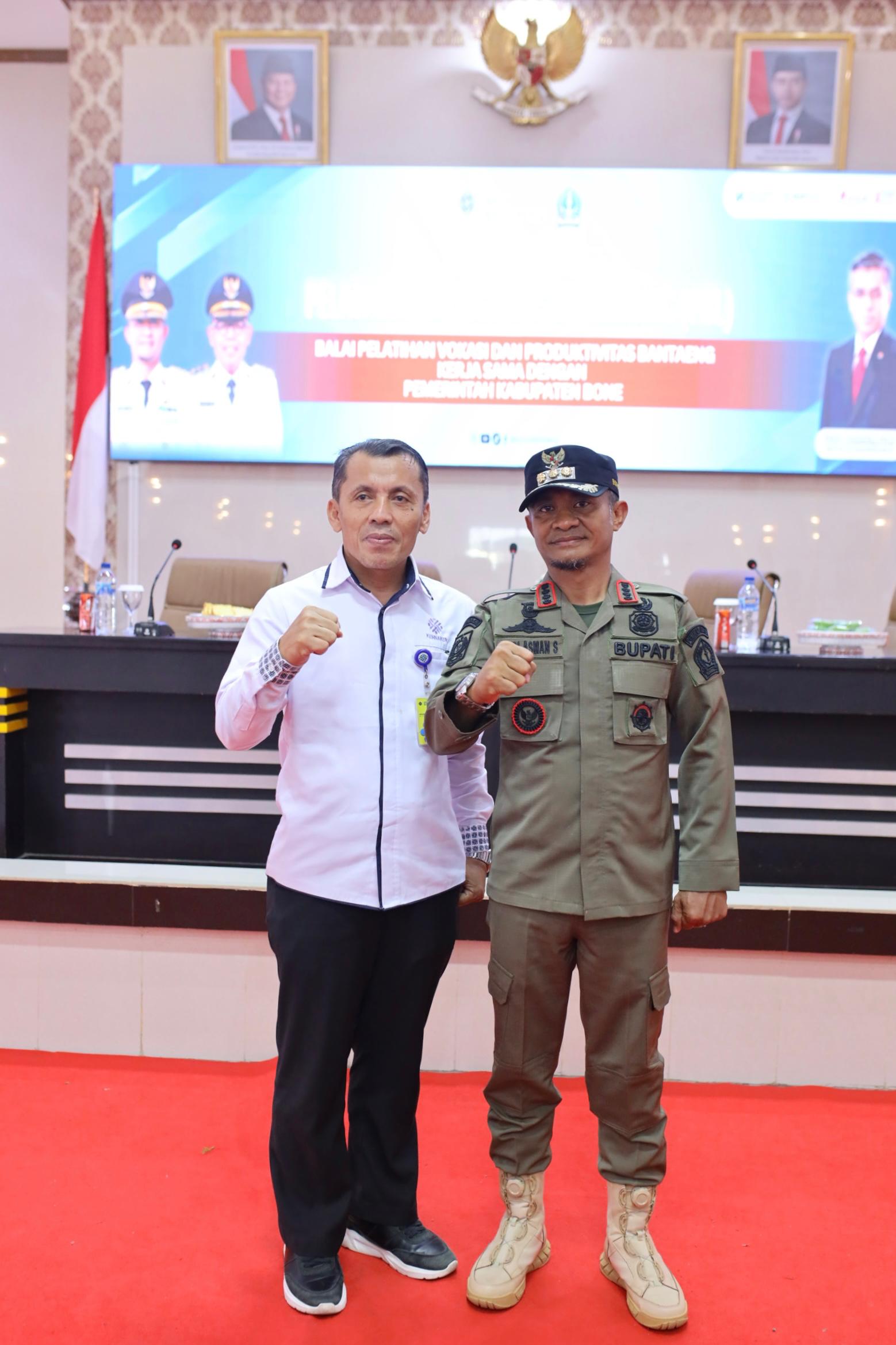 Kegiatan ini dilaksanakan di Aula Baruga Lateya Riduni Kompleks Rumah Jabatan Bupati Bone dan dibuka Langsung oleh Bupati Bone Andi Asman Sulaiman, S. Sos., MM, yang di dampingi oleh Wakil Bupati Bone Andi Akmal Pasluddin, SP., MM, bersama Kepala Balai Pelatihan Vokasi dan Produktivitas Bantaeng Arsyad, S. Ag., M. Pd.