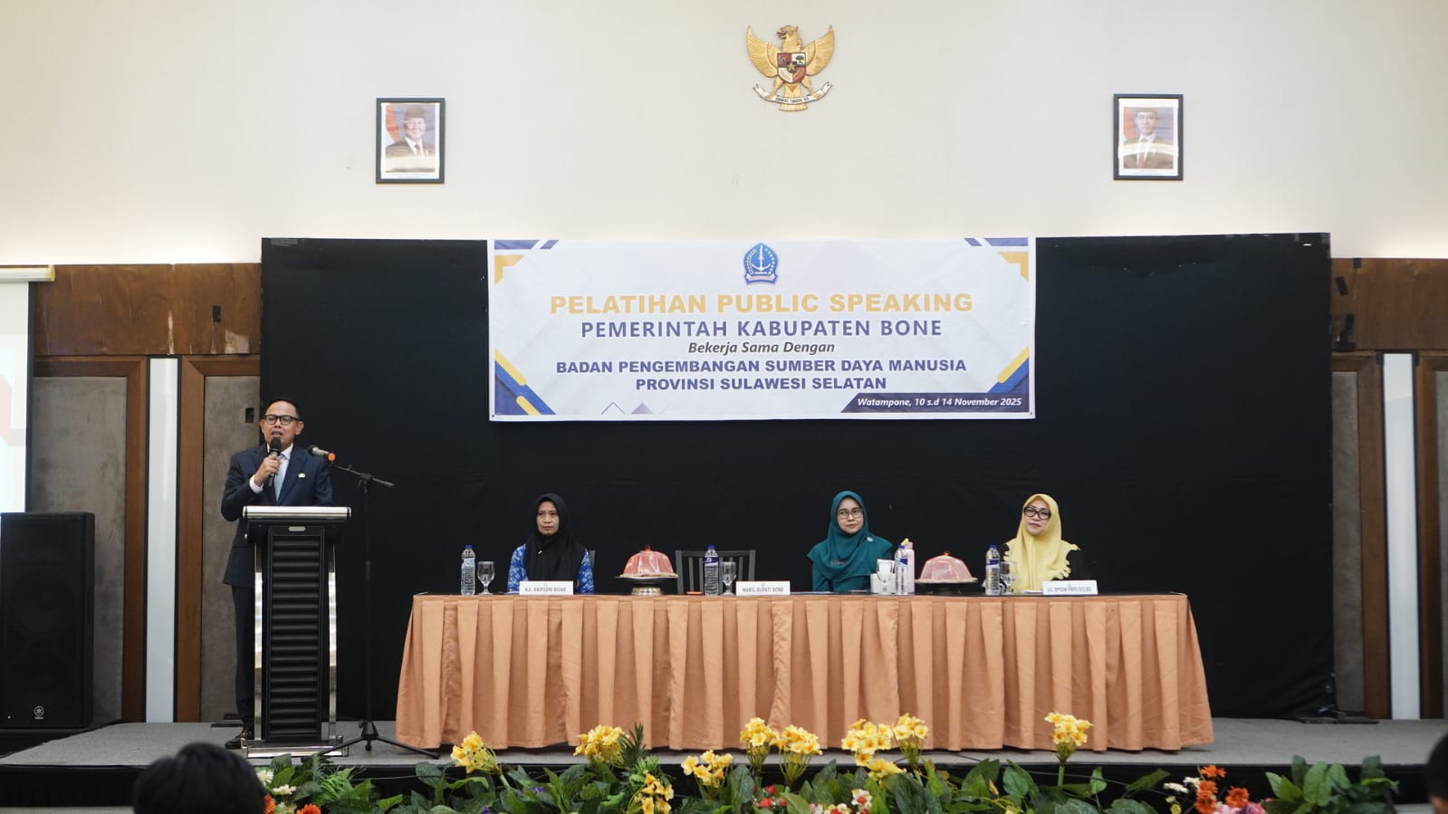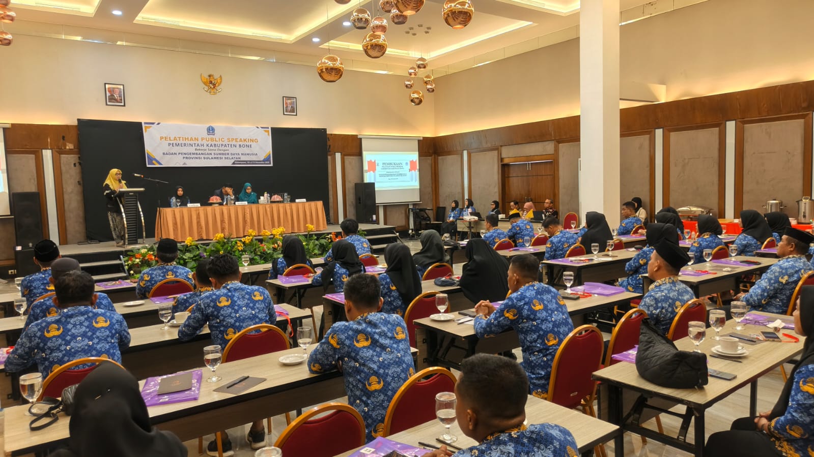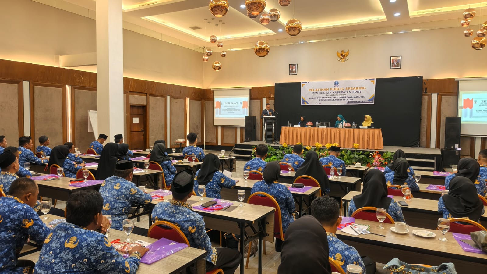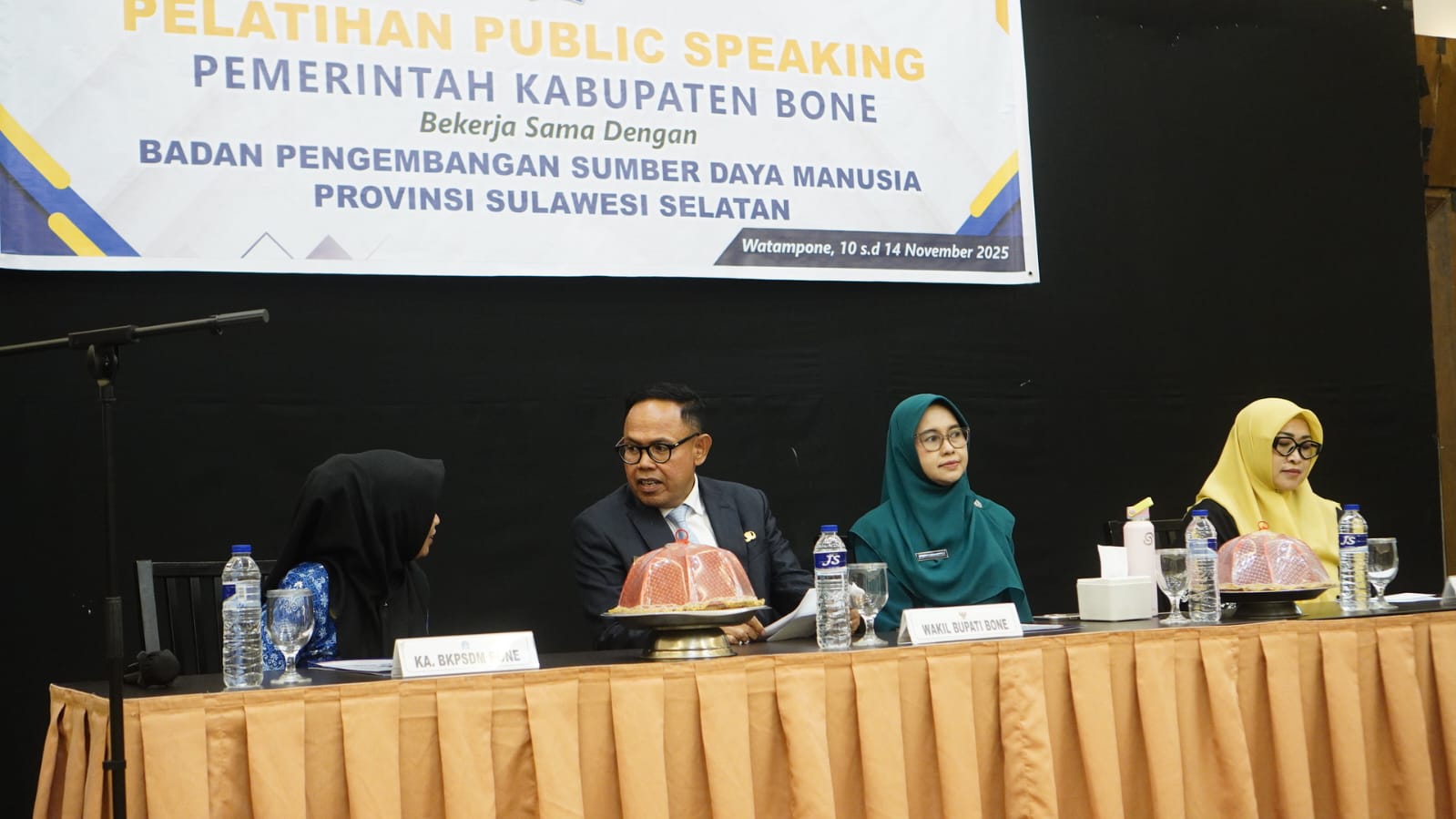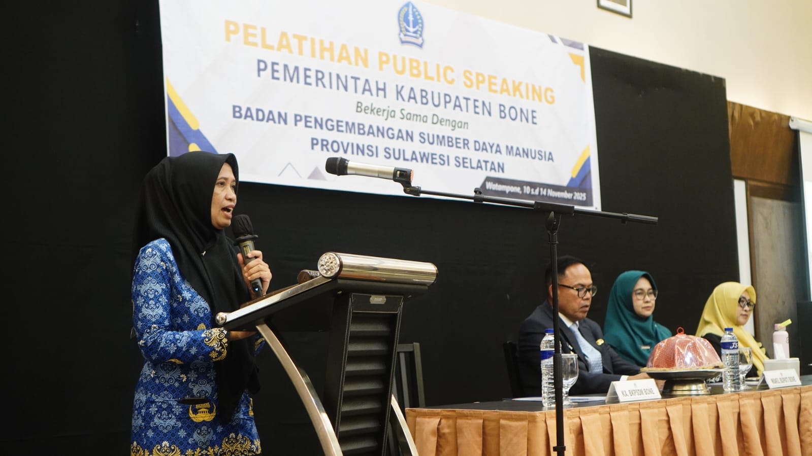 HumasBone — Wakil Bupati Bone, Dr. H. Andi Akmal Pasluddin, S.P., M.M., secara resmi membuka kegiatan Pelatihan Public Speaking bagi para lurah se-Kabupaten Bone, yang diselenggarakan oleh Pemerintah Kabupaten Bone bekerja sama dengan Badan Pengembangan Sumber Daya Manusia (BPSDM) Provinsi Sulawesi Selatan, bertempat di Hotel Helios, Jalan Langsat, Watampone, Senin (10/11/2025).