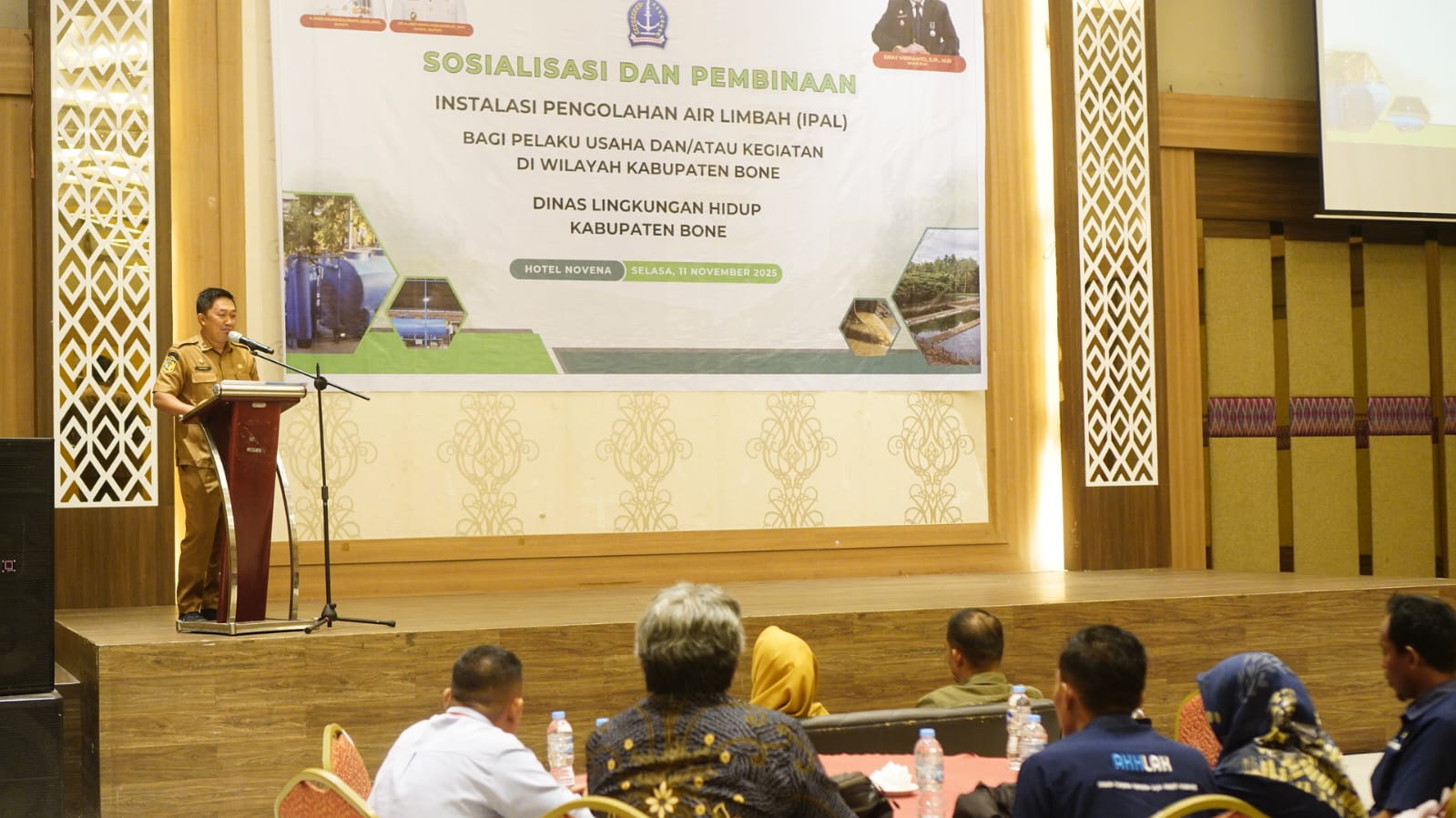 HumasBone – Pj. Sekda Bone, A. Saharuddin, S.STP., M.Si., membuka Sosialisasi dan Pembinaan Instalasi Pengolahan Air Limbah (IPAL) bagi pelaku usaha di Kabupaten Bone, Selasa (11/11/2025). Kegiatan ini diinisiasi oleh Dinas Lingkungan Hidup Kabupaten Bone dan dihadiri oleh Kepala DLH Bone, Sekretaris DLH Bone, dan tamu undangan lainnya.