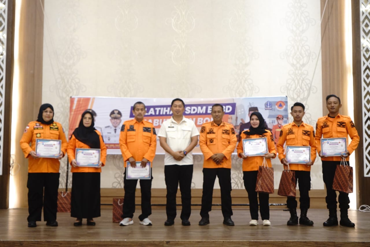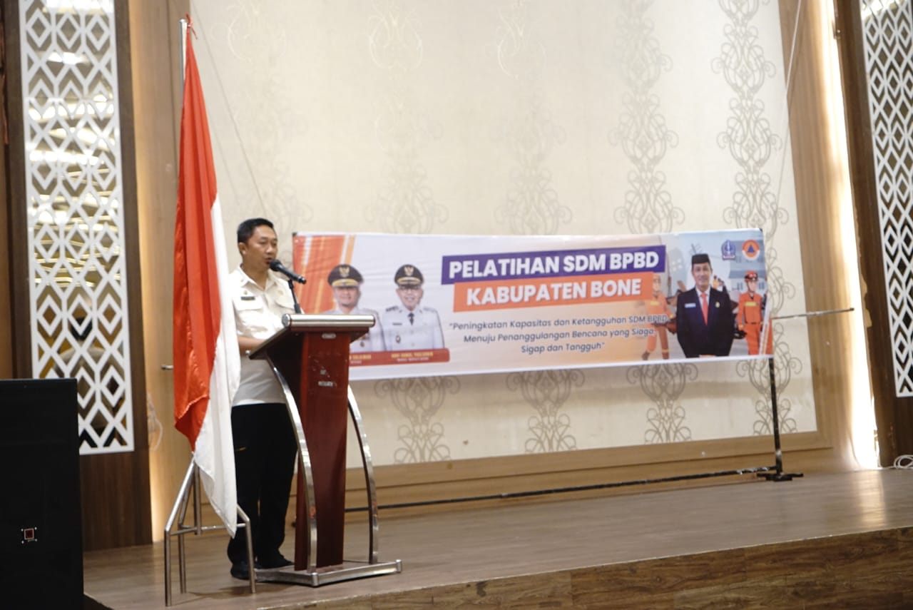 Mewakili Bupati Bone, Pj. Sekretaris Daerah Kabupaten Bone H. A. Saharuddin, S.STP., M.Si. didampingi Kepala BPBD Kabupaten Bone Andi Ikbal, S.STP., secara resmi membuka Pelatihan Sumber Daya Manusia (SDM) BPBD Kabupaten Bone dengan tema: