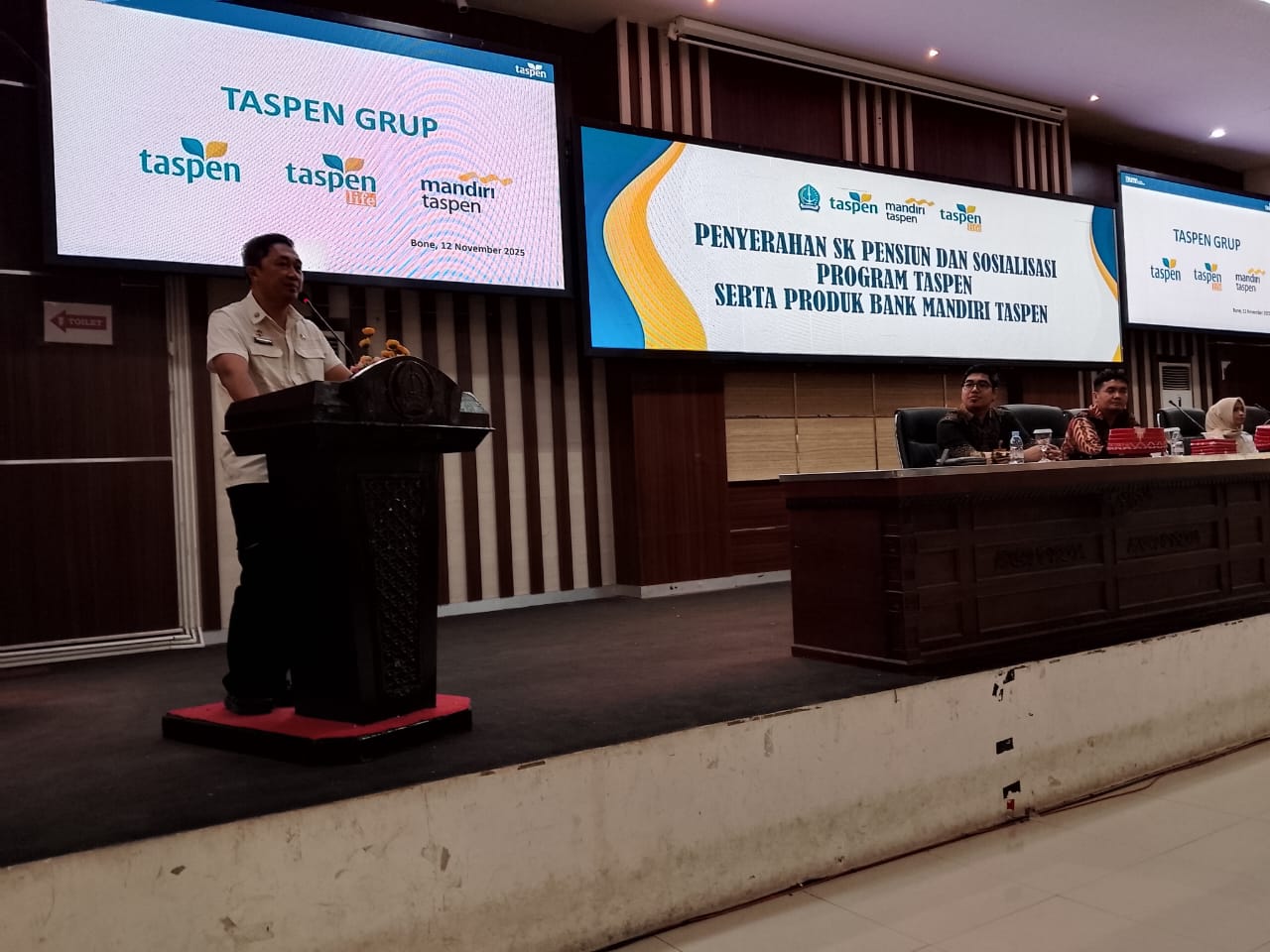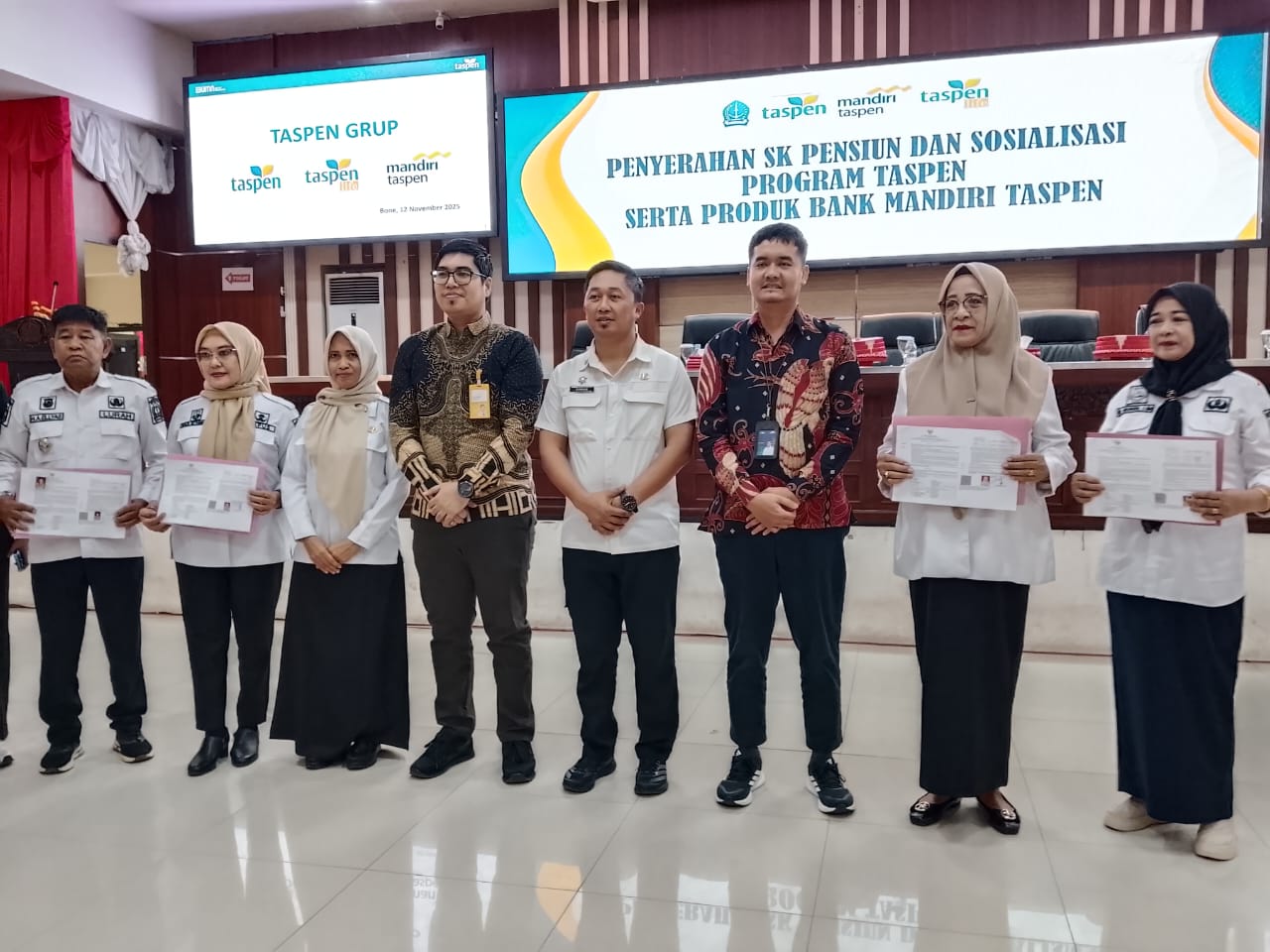 HumasBone – Pemerintah Kabupaten Bone melalui Badan Kepegawaian dan Pengembangan Sumber Daya Manusia (BKPSDM) bekerja sama dengan PT Taspen Group menggelar acara penyerahan Surat Keputusan (SK) Pensiun sekaligus sosialisasi program Taspen serta produk Bank Mandiri Taspen.