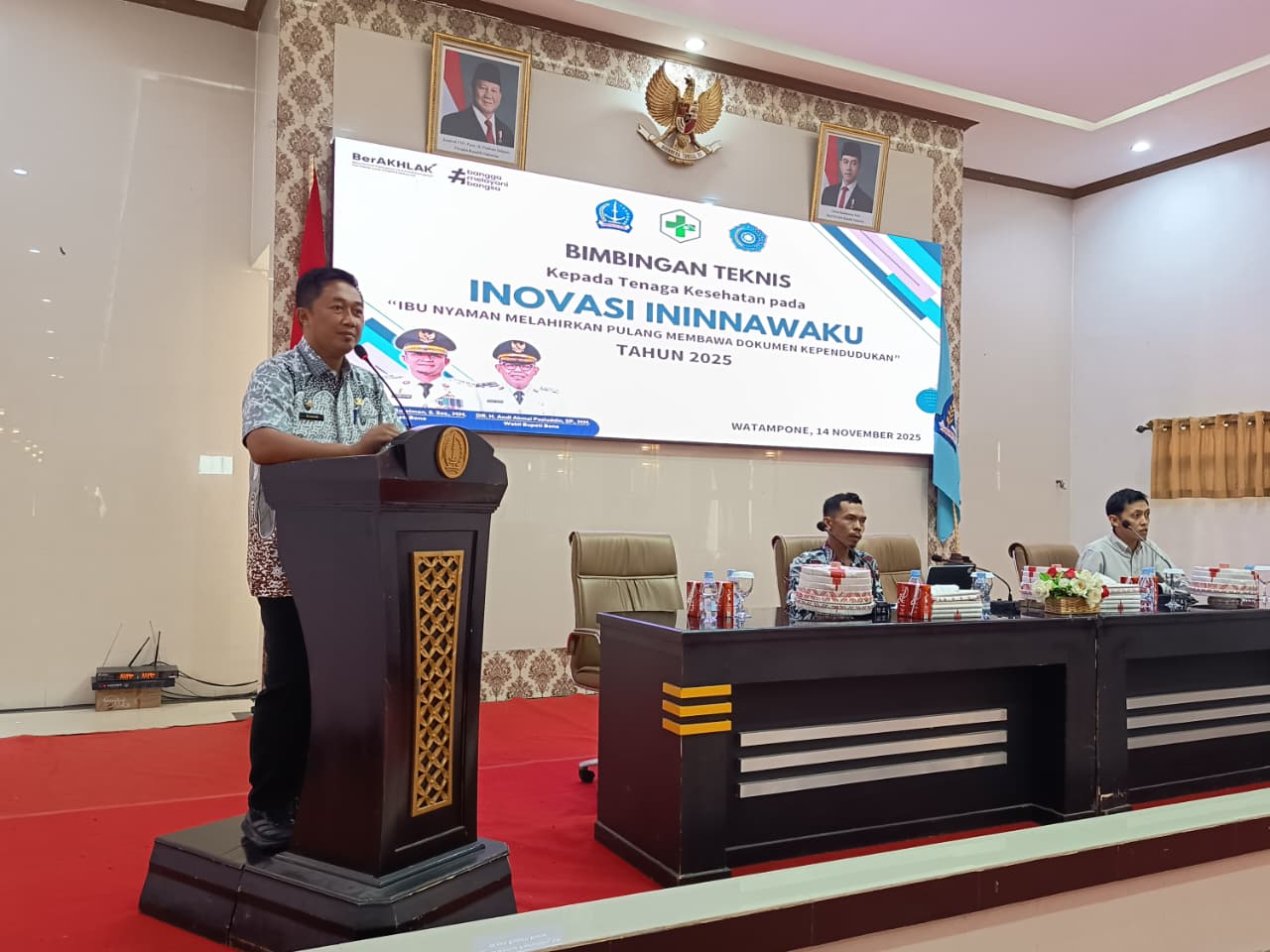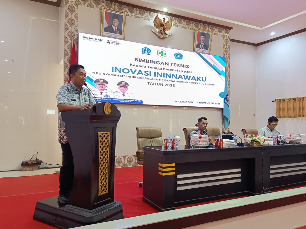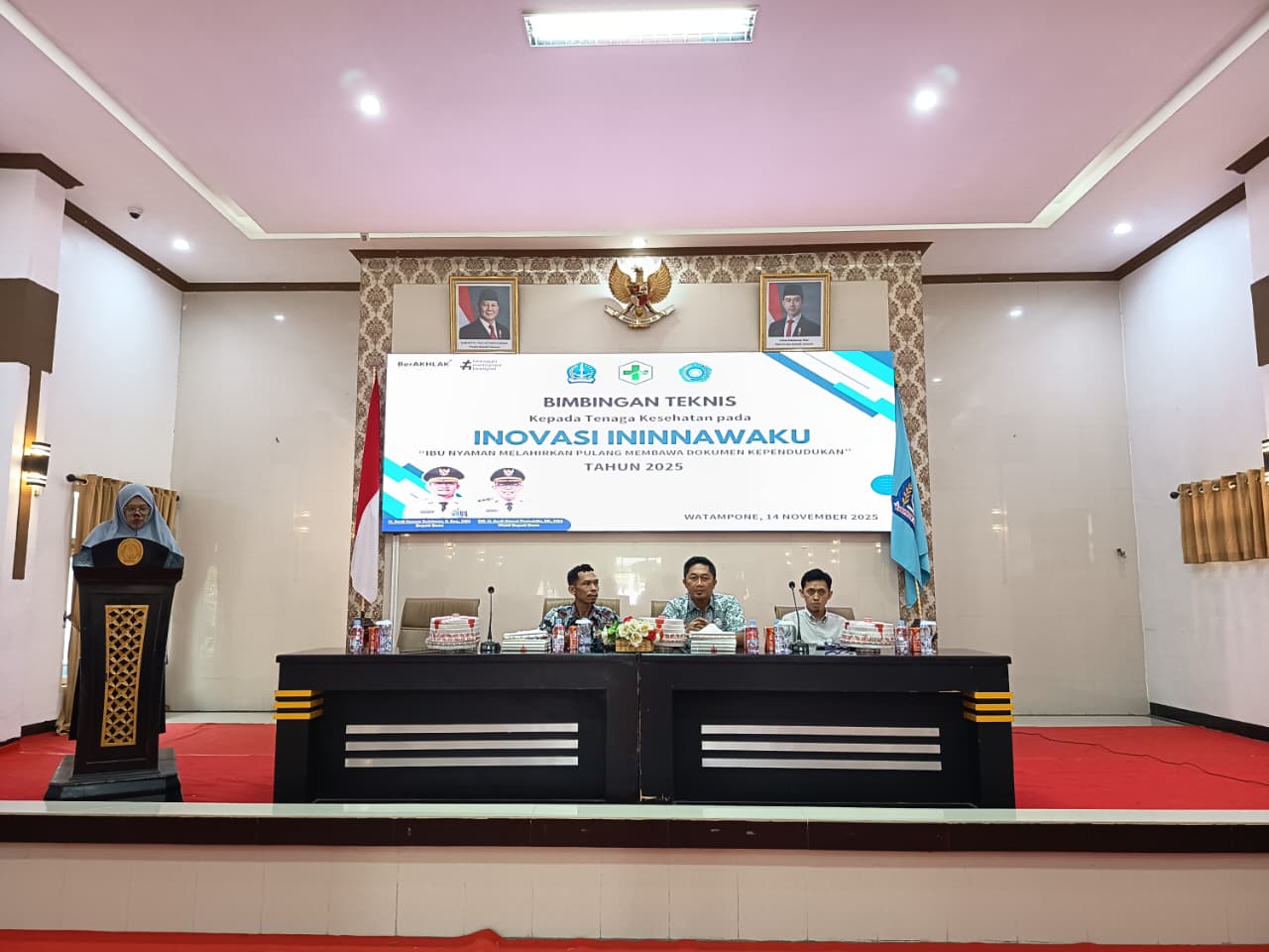 HumasBone – Pemerintah Kabupaten Bone melalui Dinas Kependudukan dan Pencatatan Sipil (Disdukcapil) menggelar Bimbingan Teknis Inovasi ININNAWAKU (Ibu Menyusui Membawa Pulang Dokumen Kependudukan) dan AYO DOAKAN (Layanan Online Dokumen Akta Kematian) kepada garda terdepan Pelayanan Kesehatan yang ada di Kabupaten Bone. Kegiatan ini merupakan wujud komitmen Pemkab Bone dalam memperkuat sinergi pelayanan administrasi kependudukan yang cepat, akurat, dan terintegrasi. Kegiatan ini terlaksana pada Jumat, 14/11/2025 di Aula Baruga Lateya riduni Kompleks Rumah jabatan Bupati Bone.