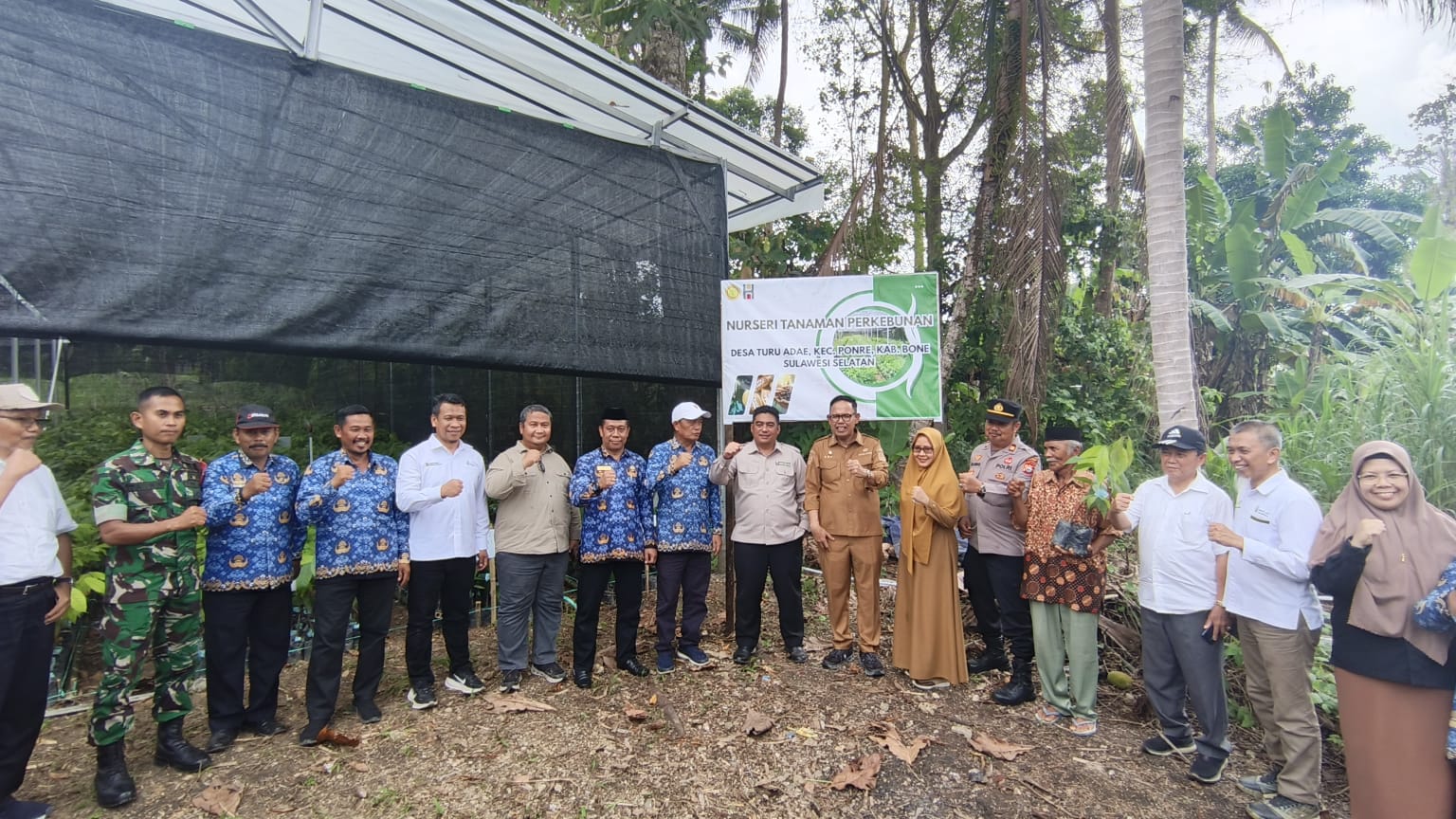 HumasBone— Direktorat Jenderal Perkebunan Kementerian Pertanian RI melalui Dr. Abd. Roni Angkat, S.TP., M.Si., bersama Wakil Bupati Bone Dr. H. Andi Akmal Pasluddin, SP., MM., meresmikan dan menyerahkan Nurseri Tanaman Perkebunan kepada para petani di Desa Turu Adae, Kecamatan Ponre, Senin (17/11/2025).