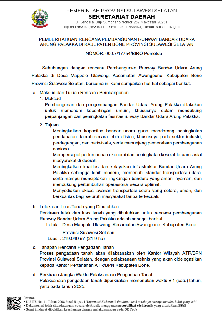 PEMBERITAHUAN RENCANA PEMBANGUNAN RUNWAY BANDAR UDARA ARUNG PALAKKA DI KABUPATEN BONE PROVINSI SULAWESI SELATANADMIN BONEGOID25 November 2025BERITA662 Dilihat Post Views: 662 Posting TerkaitBupati Bone Sambut Rencana Kegiatan “Laten Mengabdi” PMB-UH LatenritattaBupati Bone Terima Audiensi Komunitas Tionghoa dan IPM Kabupaten BoneBupati Bone Resmikan Dua Unit Bedah Rumah Tidak Layak Huni di Tanete Riattang TimurBupati Bone Resmikan Jalan Beton Akses Bandara Arung Palakka di AwangponePeringati Isra Mi’raj Nabi Muhammad SAW, Pemkab Bone Teguhkan Spirit Kerukunan BeragamaBupati Bone Hadiri Syukuran HUT ke-65 Bank Sulselbar Cabang BoneBupati Bone Resmikan Peningkatan Jalan Aspal Ruas Jalan Perintis, Perkuat Infrastruktur PerkotaanWujudkan Komitmen Beramal, Bupati Bone Resmikan Peningkatan Jalan Aspal Ruas Cani Sidenreng–Baruttunge–SiameBaca Juga :Bupati Bone Sambut Rencana Kegiatan “Laten Mengabdi” PMB-UH LatenritattaBupati Bone Terima Audiensi Komunitas Tionghoa dan IPM Kabupaten BoneBupati Bone Resmikan Dua Unit Bedah Rumah Tidak Layak Huni di Tanete Riattang TimurBupati Bone Resmikan Jalan Beton Akses Bandara Arung Palakka di Awangpone