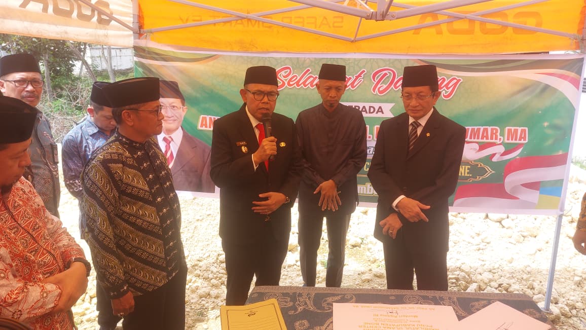 HumasBone – Wakil Bupati Bone Dr. H. Andi Akmal Pasluddin, S.P., M.M. mendampingi Menteri Agama RI AG. Prof. Dr. KH. Nasaruddin Umar, M.A. pada acara Peletakan Batu Pertama Pembangunan Gedung Nahdlatul Ulama (NU) Center PCNU Kabupaten Bone.