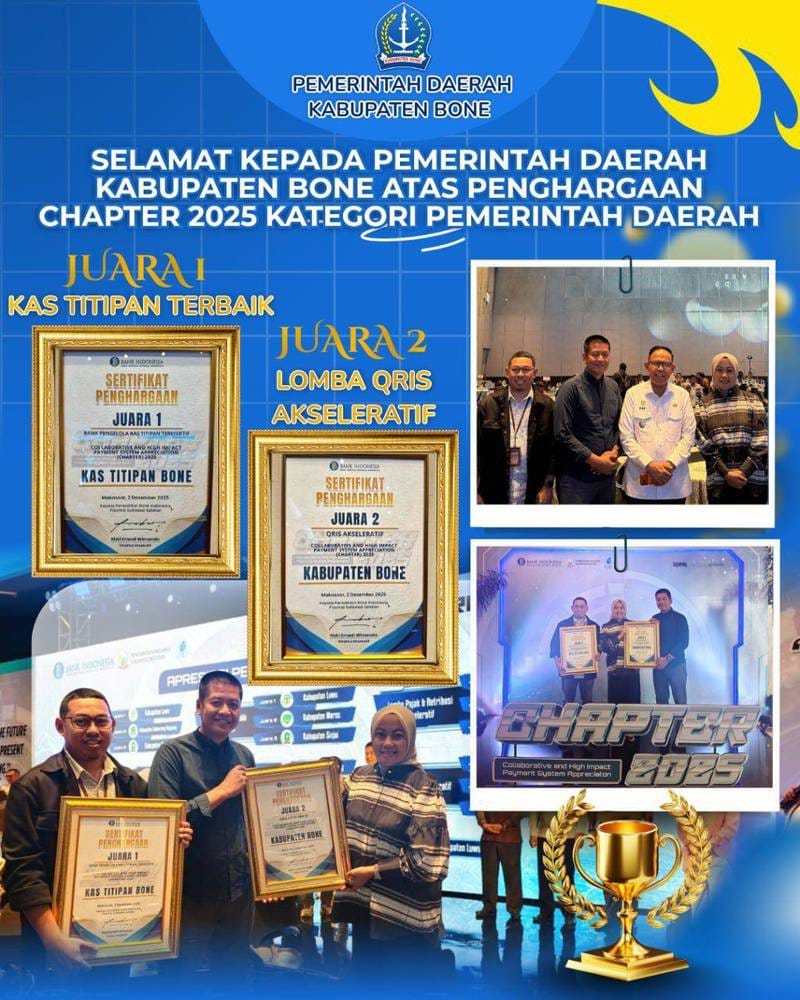 HumasBone – Kabupaten Bone kembali menunjukkan komitmennya dalam transformasi digital dengan meraih Juara 2 Kategori QRIS Akseleratif di ajang Collaborative and High-Impact Payment System Appreciation (CHAPTER) 2025. Kegiatan ini digelar oleh Kantor Perwakilan Bank Indonesia (BI) Sulawesi Selatan di Sandeq Ballroom, Claro Hotel Makassar, pada Selasa (2/12/2025).