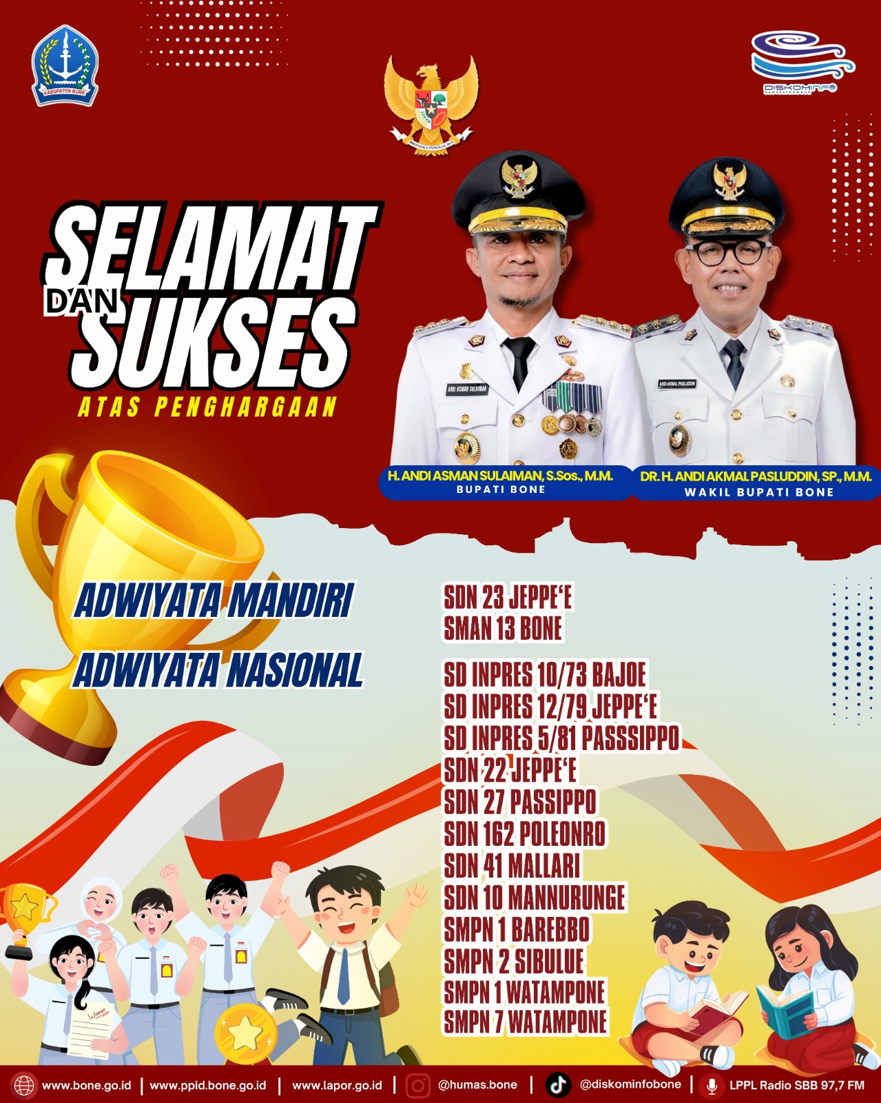 Pada kesempatan tersebut, Bupati Bone memberikan apresiasi setinggi-tingginya kepada para kepala sekolah serta seluruh civitas sekolah yang telah menunjukkan komitmen kuat dalam membangun budaya peduli lingkungan melalui implementasi program Adiwiyata. Tahun ini, sebanyak 15 sekolah di Kabupaten Bone secara kolektif berhasil meraih penghargaan Adiwiyata Mandiri dan Adiwiyata Nasional dari Menteri Lingkungan Hidup/Kepala Badan Pengendalian Lingkungan Hidup.