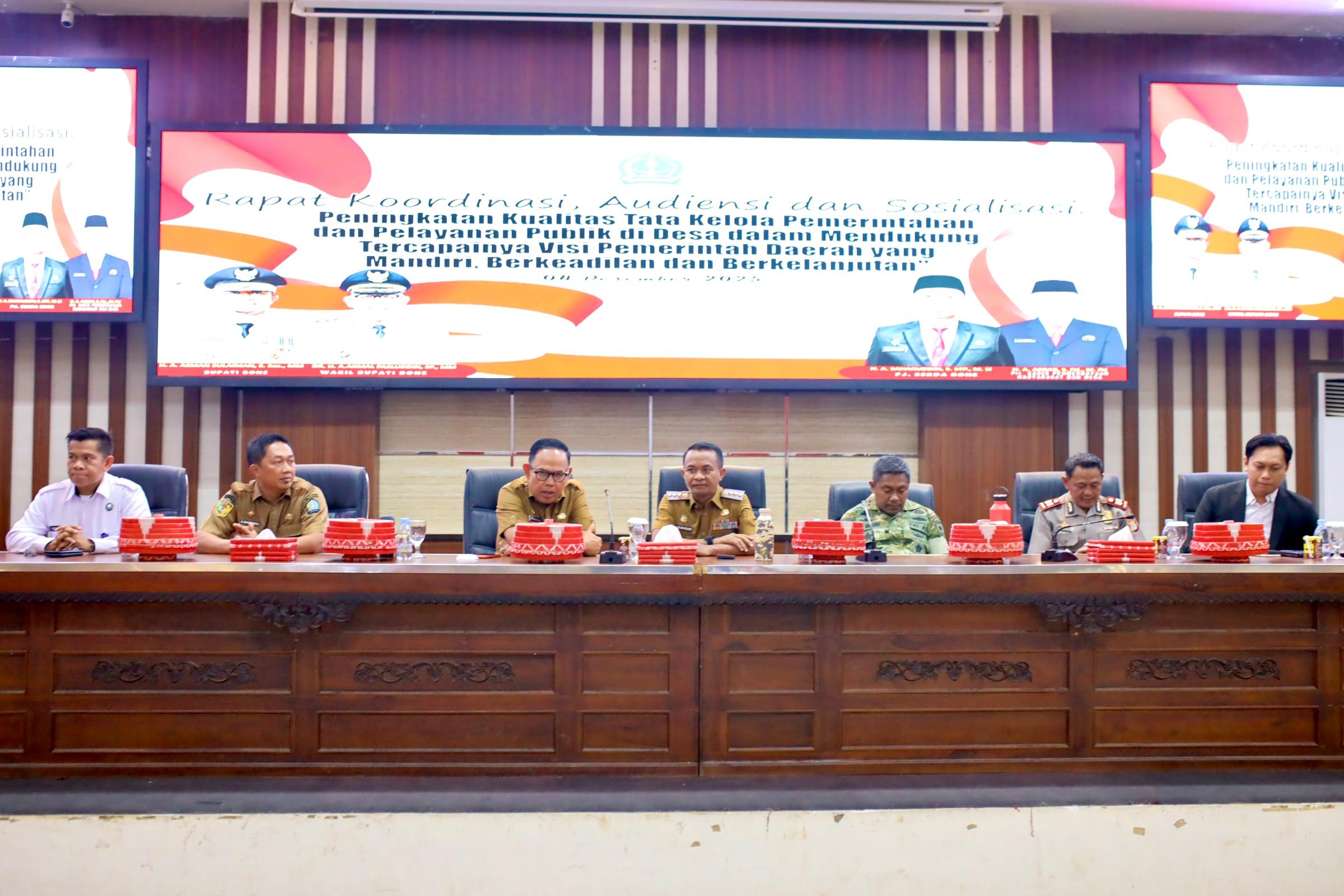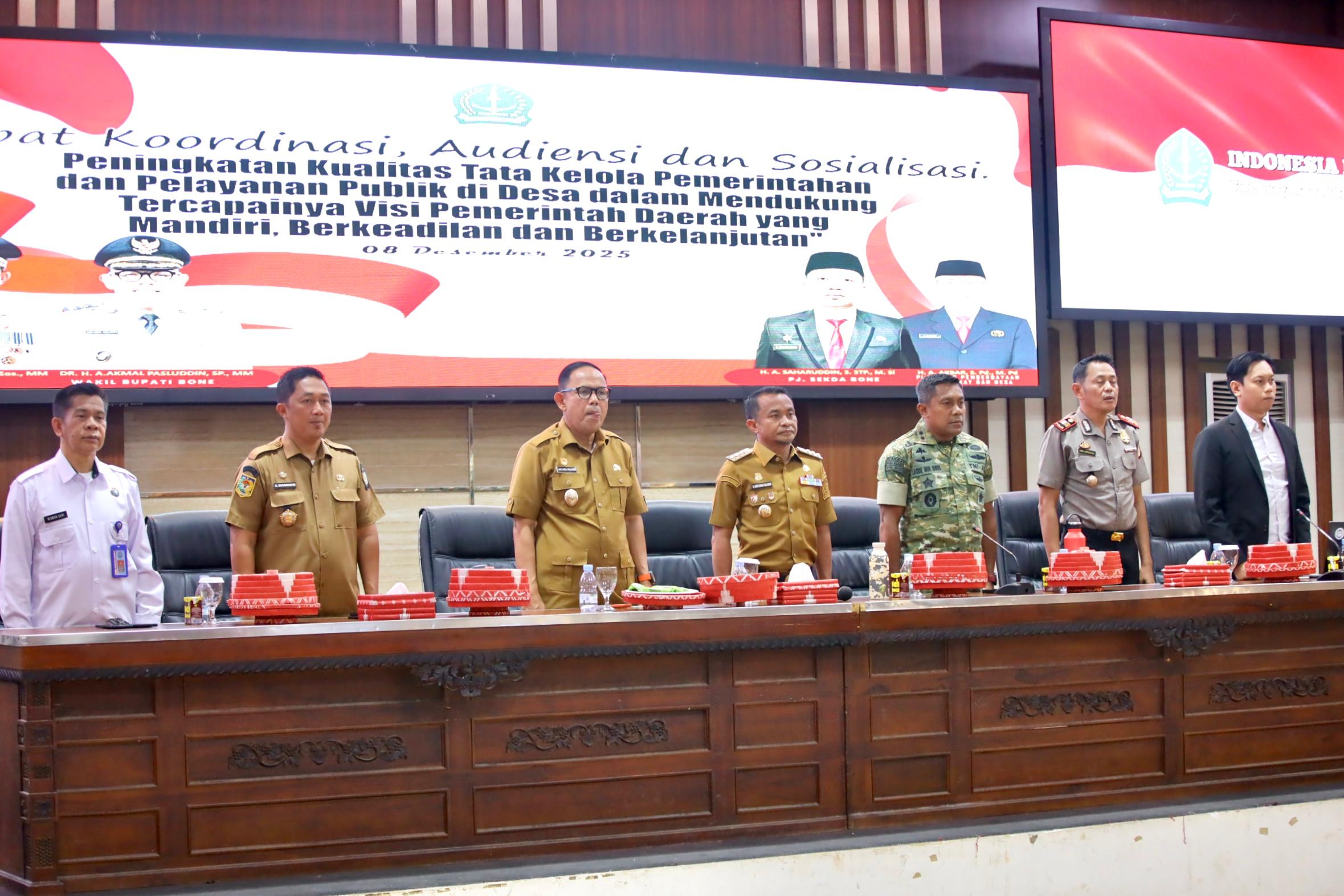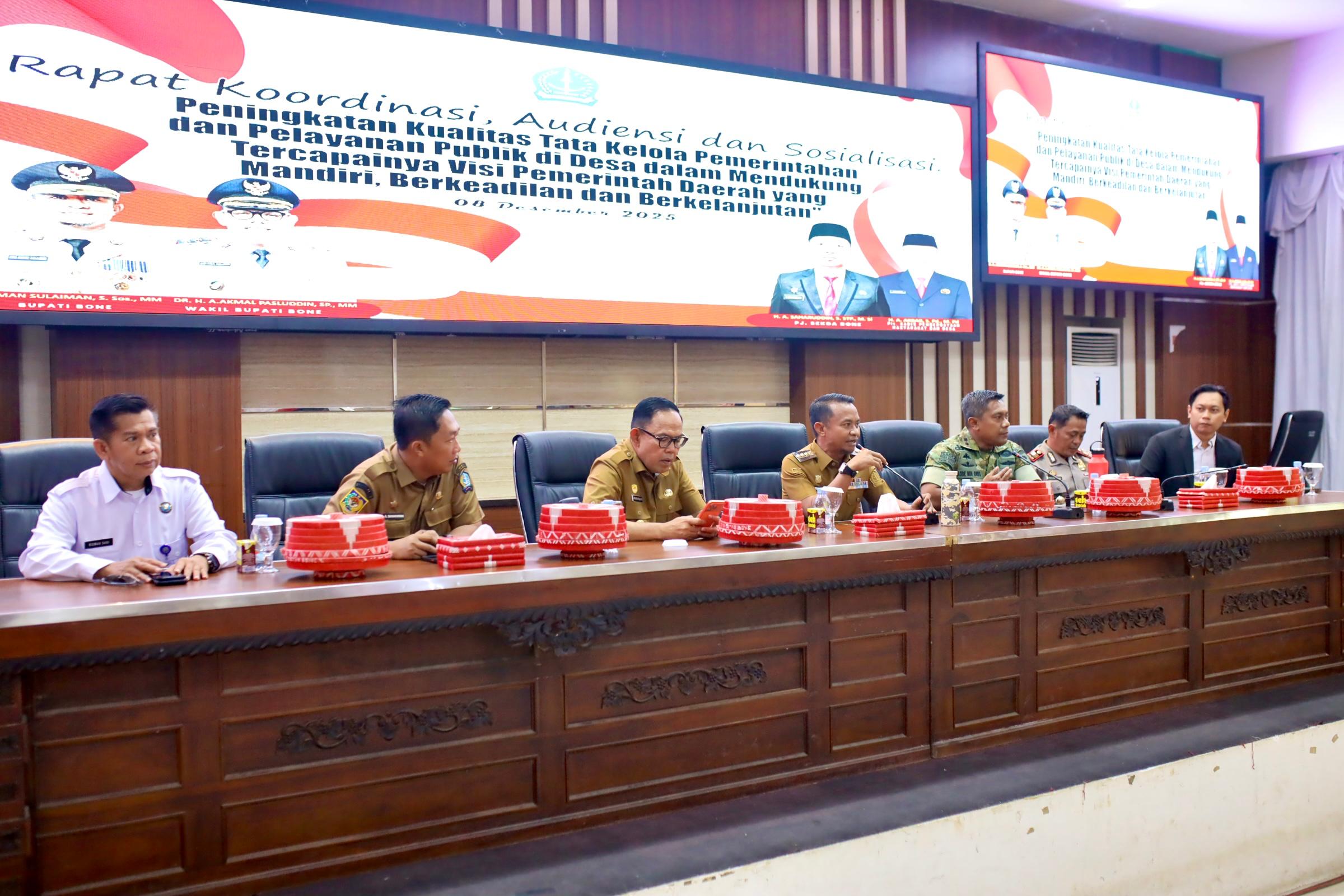 HumasBone – Bupati Bone, H. Andi Asman Sulaiman, S.Sos., M.M., didampingi Wakil Bupati Bone, Dr. H. Andi Akmal Pasluddin, S.P., M.M., bersama Forkopimda Bone memimpin Rapat Koordinasi sekaligus menerima audiensi para Kepala Desa se-Kabupaten Bone. Kegiatan ini menjadi wadah konsolidasi pemerintah daerah dengan pemerintahan desa dalam memperkuat sinergi pembangunan.