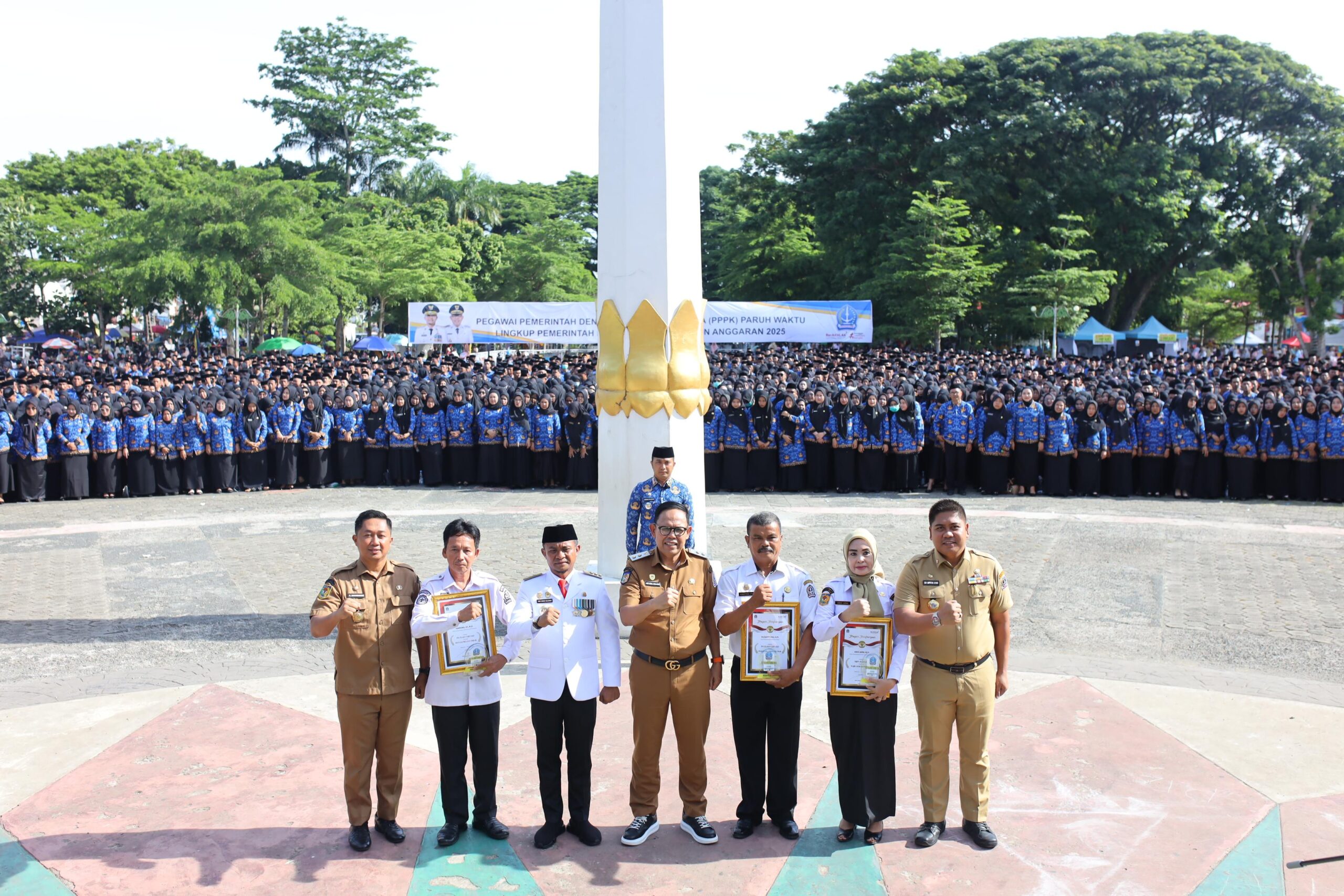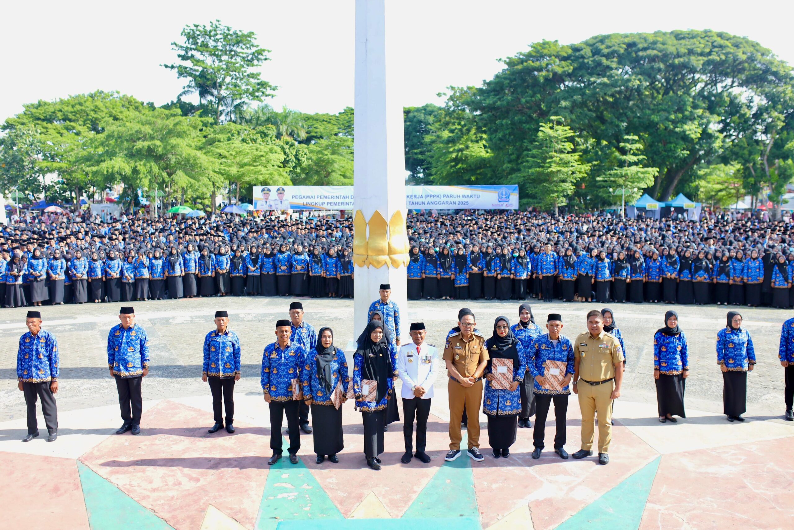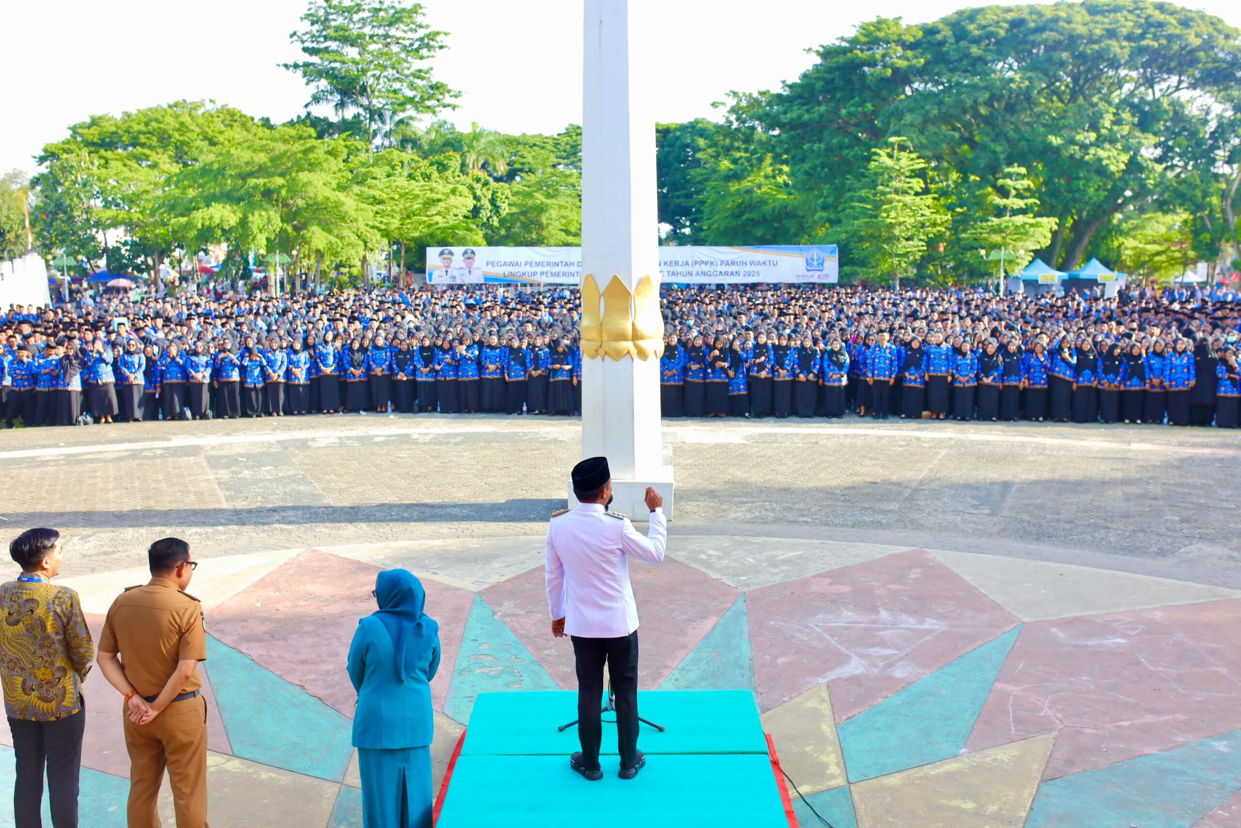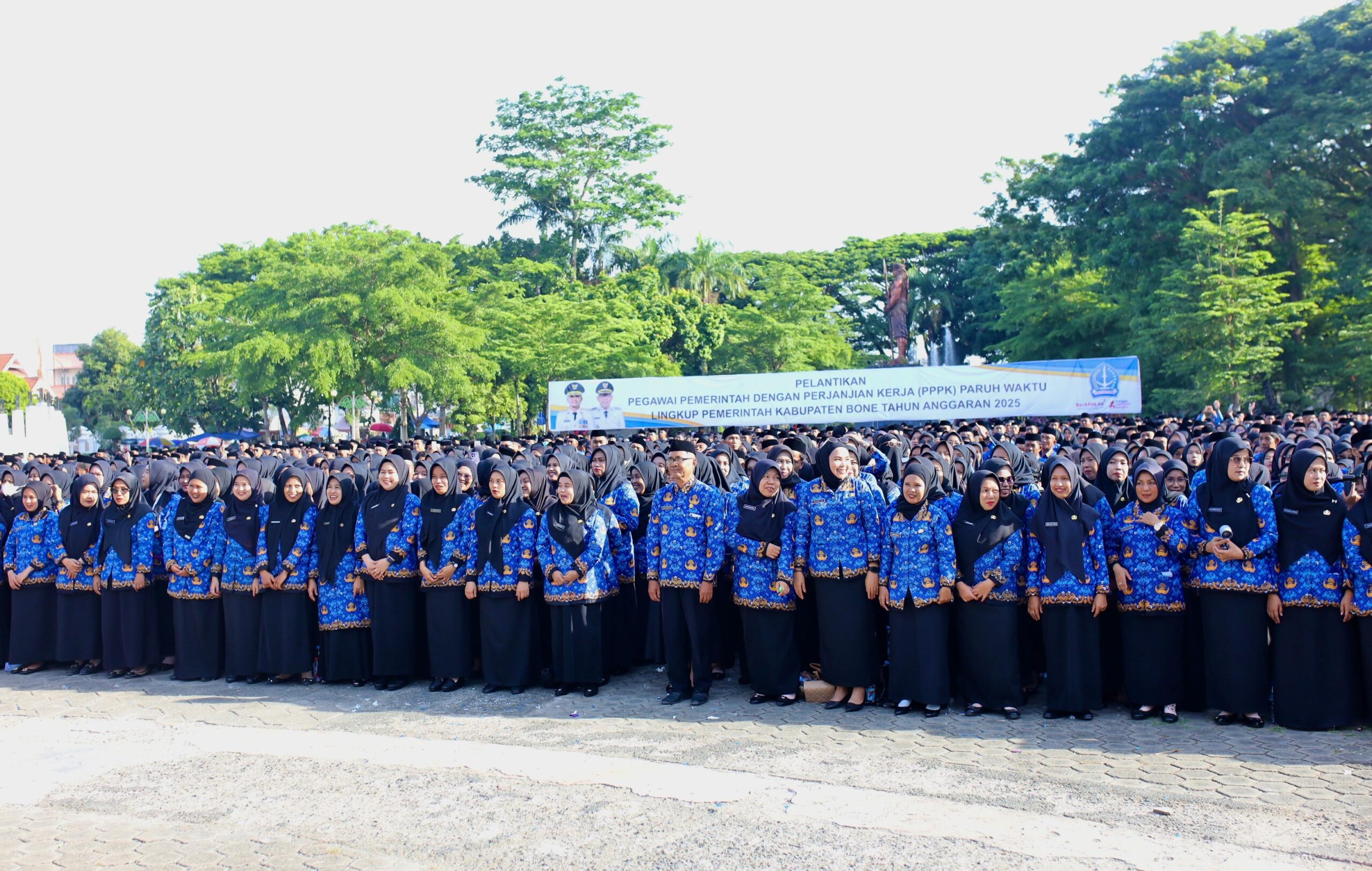 HumasBone – Bupati Bone, H. Andi Asman Sulaiman, S.Sos., M.M., didampingi Ketua TP PKK Kabupaten Bone Hj. Maryam A. Asman, bersama Wakil Bupati Bone Dr. H. Andi Akmal Pasluddin, S.P., M.M., secara resmi melantik sebanyak 4.411 Pegawai Pemerintah dengan Perjanjian Kerja (PPPK) Paruh Waktu (PW). Pelantikan berlangsung khidmat di Lapangan Merdeka Bone, Rabu, 24 Desember 2025.