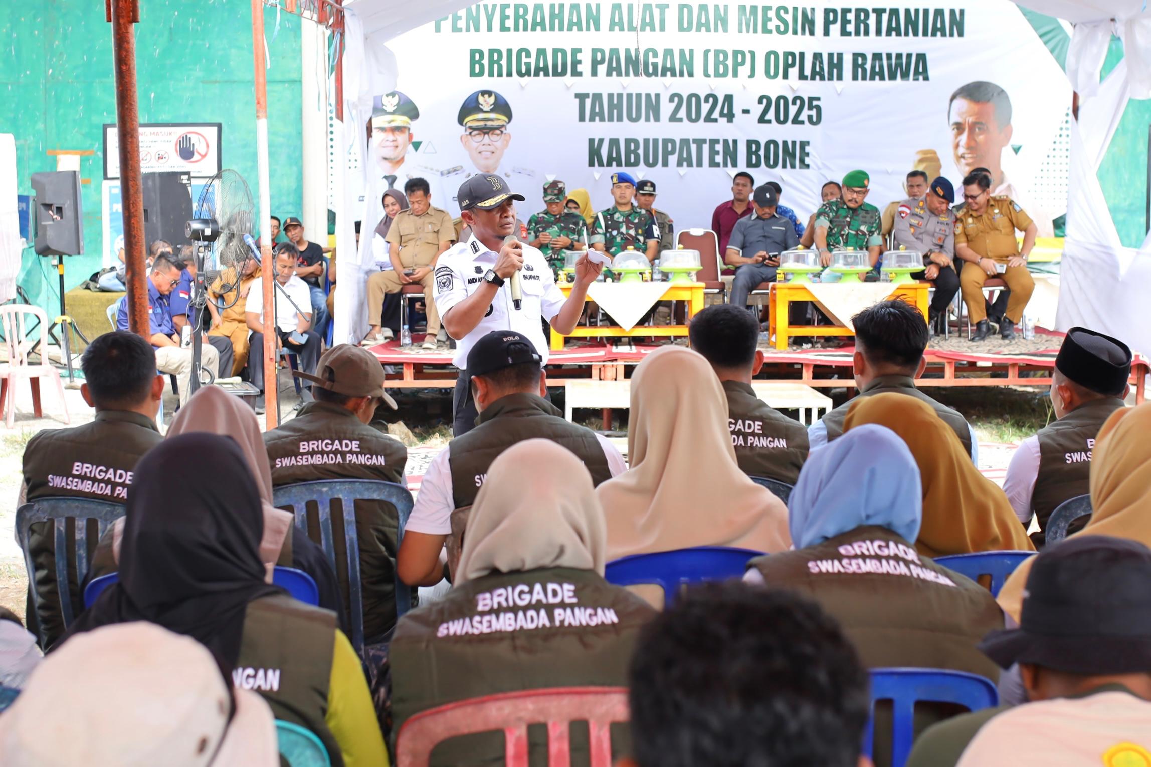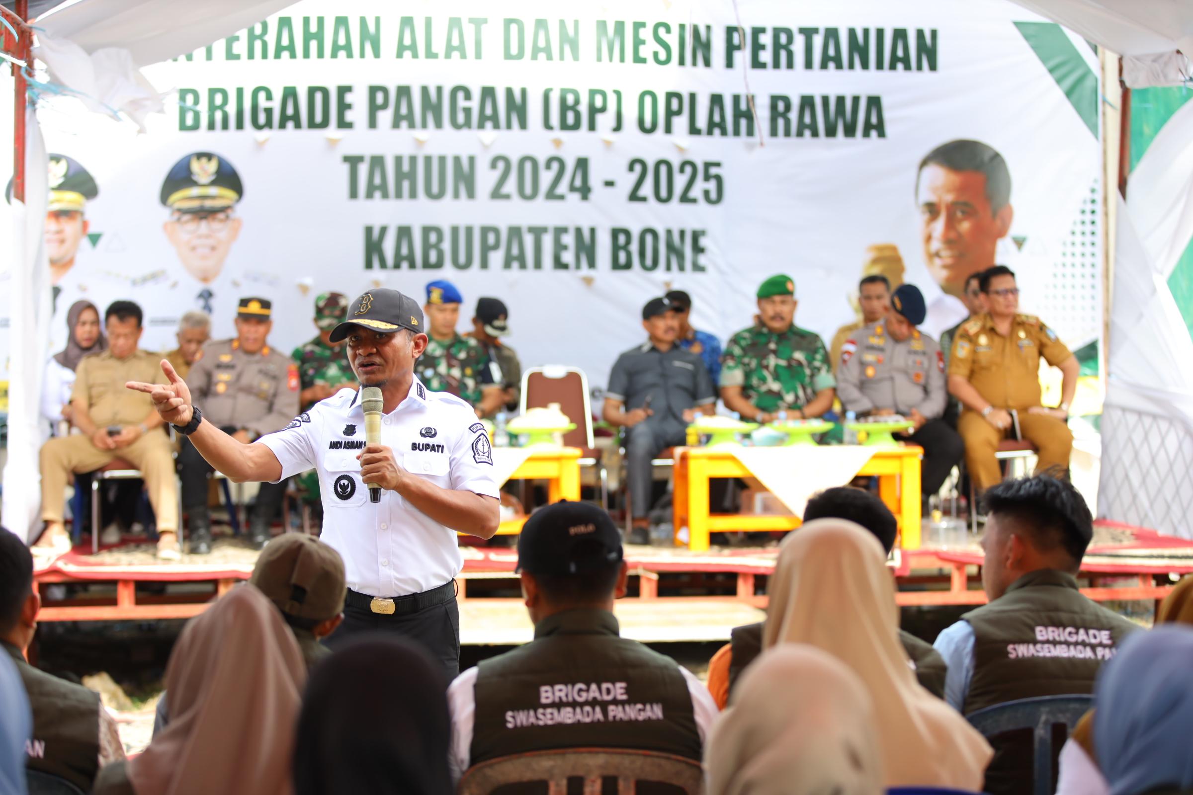 Dalam sambutannya, Bupati Bone menyampaikan rasa syukur dan terima kasih atas kehadiran seluruh pihak yang turut mendukung kegiatan tersebut. Ia menjelaskan bahwa Brigade Pangan merupakan kelompok petani milenial yang menjadi penggerak budidaya tanaman padi secara modern, yang didukung pemerintah pusat melalui penyediaan alat dan mesin pertanian guna memperlancar usaha tani dan mendorong tercapainya swasembada pangan.