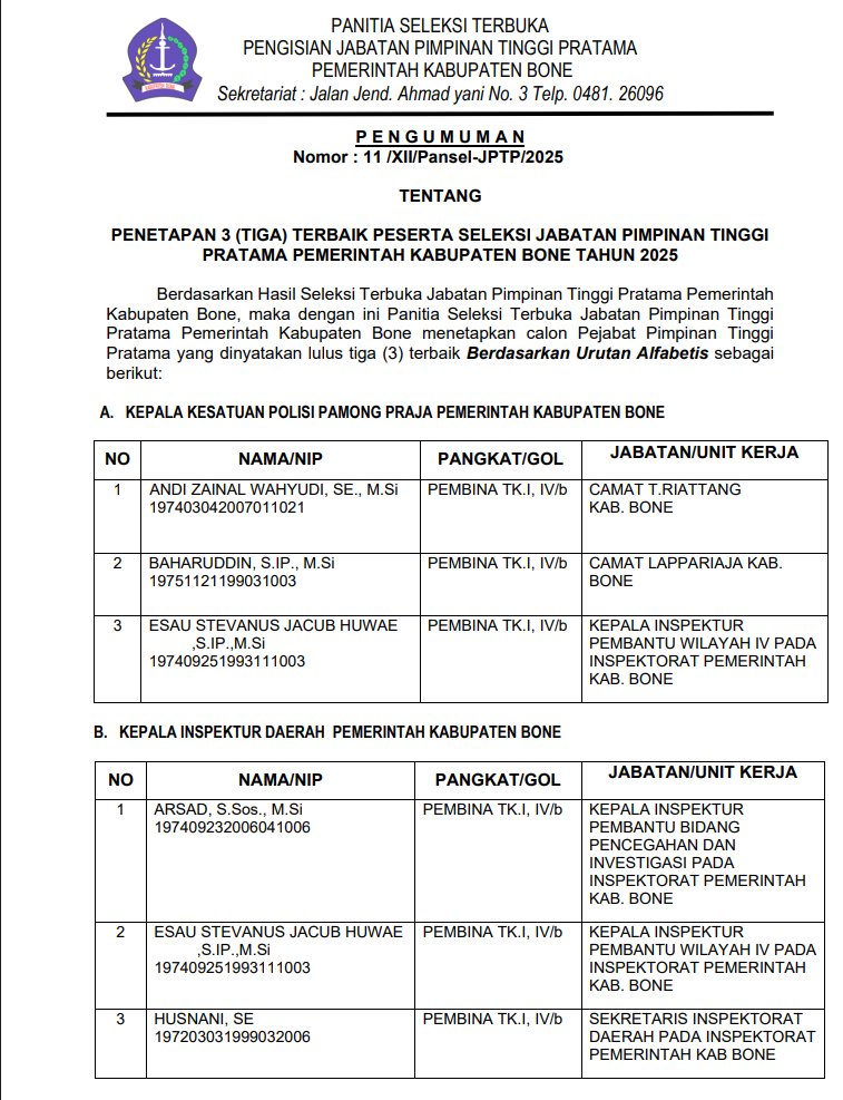 Pengumuman Penetapan 3 Terbaik Peserta Seleksi JPTP Pemkab Bone Tahun 2025ADMIN BONEGOID24 Desember 2025BERITA2459 Dilihat Post Views: 2,459 Posting TerkaitBupati dan Wakil Bupati Bone Ikuti Rakor Tindak Lanjut Arahan Presiden RI Bersama Forkopimda se-SulselWakil Bupati Bone Lepas Jalan Santai Uncapi yang Dirangkaikan Car Free DayWakil Bupati Bone Hadiri Malam Jurnalis Awards 2026, Apresiasi Peran Pers dalam Pembangunan DaerahWabup Bone dan Dandim 1407 Bone Meriahkan Laga Ekshibisi Mini Soccer Bersama Jurnalis pada HPN 2026Wakil Bupati Bone Hadiri Seminar Literasi Media HPN 2026, Ajak Pelajar Cerdas Bermedia SosialCoffee Morning Bersama BGN, Bupati Bone Perkuat Sinergi Program Makan Bergizi GratisPemkab Bone Serahkan Sertifikat Halal Gratis kepada Pelaku Usaha melalui Inovasi Kopi BoneLangkah Maju RSUD Tenriawaru: Dari Bone Menuju Standard Layanan NasionalBaca Juga :Bupati dan Wakil Bupati Bone Ikuti Rakor Tindak Lanjut Arahan Presiden RI Bersama Forkopimda se-SulselWakil Bupati Bone Lepas Jalan Santai Uncapi yang Dirangkaikan Car Free DayWakil Bupati Bone Hadiri Malam Jurnalis Awards 2026, Apresiasi Peran Pers dalam Pembangunan DaerahWabup Bone dan Dandim 1407 Bone Meriahkan Laga Ekshibisi Mini Soccer Bersama Jurnalis pada HPN 2026