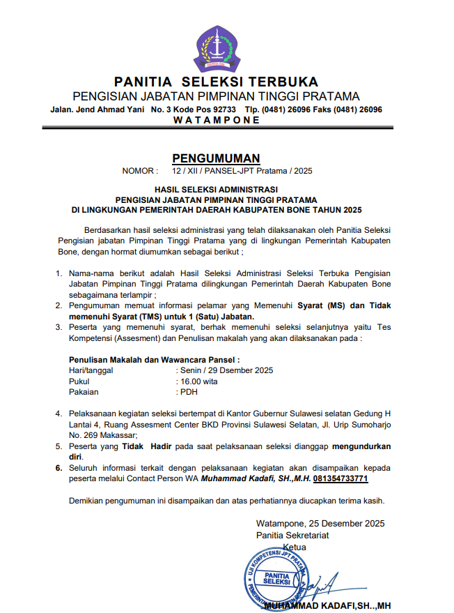Hasil Seleksi Administrasi Pengisian JPTP Kepala BKAD Kabupaten Bone Tahun 2025ADMIN BONEGOID25 Desember 2025BERITA1503 Dilihat Post Views: 1,503 Posting TerkaitWakil Bupati Bone Hadiri Seminar Literasi Media HPN 2026, Ajak Pelajar Cerdas Bermedia SosialCoffee Morning Bersama BGN, Bupati Bone Perkuat Sinergi Program Makan Bergizi GratisPemkab Bone Serahkan Sertifikat Halal Gratis kepada Pelaku Usaha melalui Inovasi Kopi BoneLangkah Maju RSUD Tenriawaru: Dari Bone Menuju Standard Layanan NasionalGroundbreaking Hilirisasi Ayam Terintegrasi di Ponre, Bupati Bone Tegaskan Komitmen Ketahanan PanganSAKIP OPD TAHUN 2025SAKIP BAPPEDA 2025Produk Unggulan Kerajinan Kabupaten Bone Tampil di INACRAFT 2026Baca Juga :Wakil Bupati Bone Hadiri Seminar Literasi Media HPN 2026, Ajak Pelajar Cerdas Bermedia SosialCoffee Morning Bersama BGN, Bupati Bone Perkuat Sinergi Program Makan Bergizi GratisPemkab Bone Serahkan Sertifikat Halal Gratis kepada Pelaku Usaha melalui Inovasi Kopi BoneLangkah Maju RSUD Tenriawaru: Dari Bone Menuju Standard Layanan Nasional