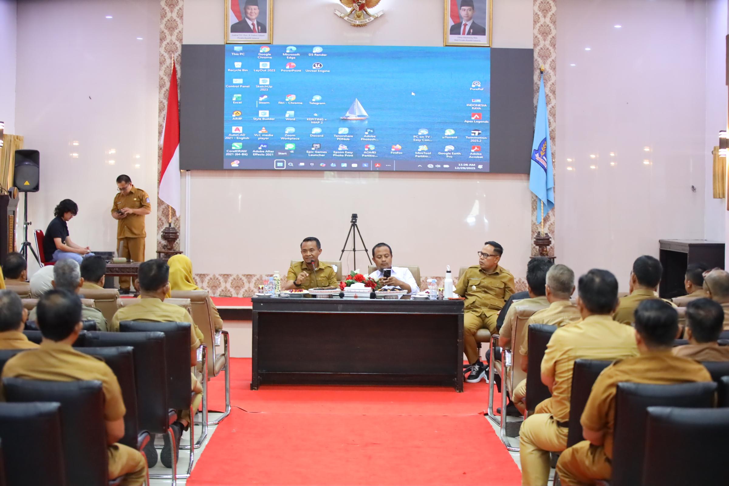 HumasBone – Gubernur Sulawesi Selatan, H. Andi Sudirman Sulaiman, S.T., memimpin Evaluasi Anggaran Pendapatan dan Belanja Daerah (APBD) Tahun 2026 secara virtual yang diikuti seluruh kepala daerah se-Sulawesi Selatan. Kegiatan tersebut berlangsung di Baruga La Teya Riduni, Rumah Jabatan Bupati Bone, Senin, 29 Desember 2025.