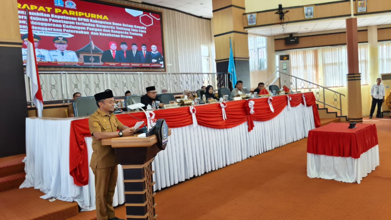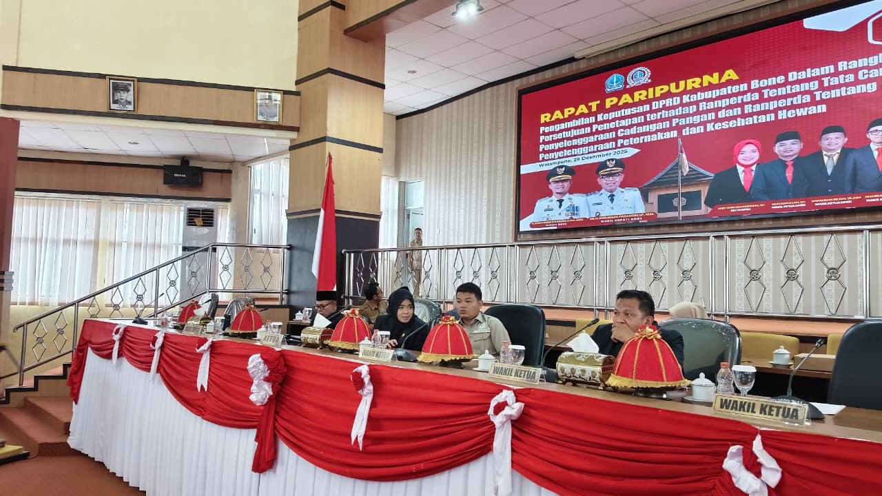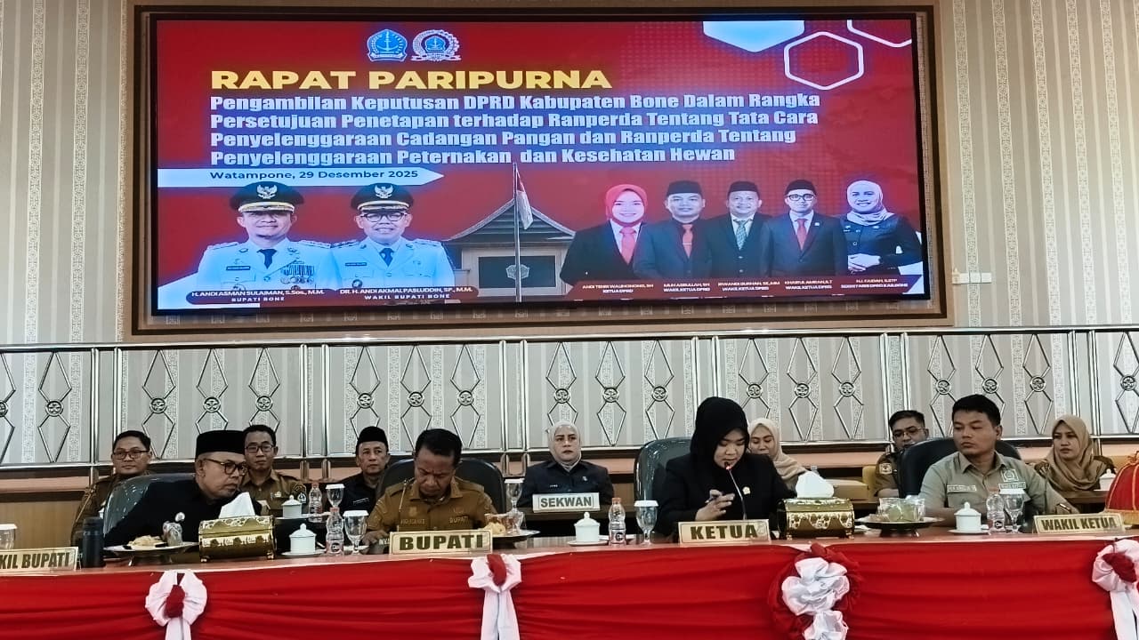 Dua Ranperda yang disetujui tersebut yakni Ranperda tentang Tata Cara Penyelenggaraan Cadangan Pangan serta Ranperda tentang Penyelenggaraan Peternakan dan Kesehatan Hewan. Rapat Paripurna berlangsung di Ruang Rapat Paripurna Kantor DPRD Bone dan dipimpin langsung oleh Ketua DPRD Bone, Andi Tenri Walinonong, S.E.