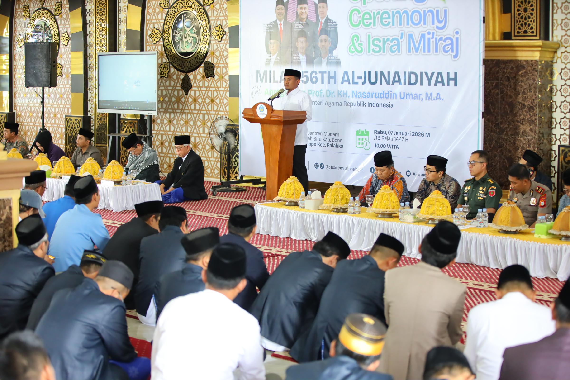 HumasBone – Bupati Bone H. Andi Asman Sulaiman, S.Sos., M.M., menghadiri Opening Ceremony dan Peringatan Isra Mi’raj Nabi Muhammad SAW yang dirangkaikan dengan Milad ke-56 Pondok Pesantren Modern Al-Junaidiyah Biru, Rabu (7/1/2026) atau bertepatan 18 Rajab 1447 H.
