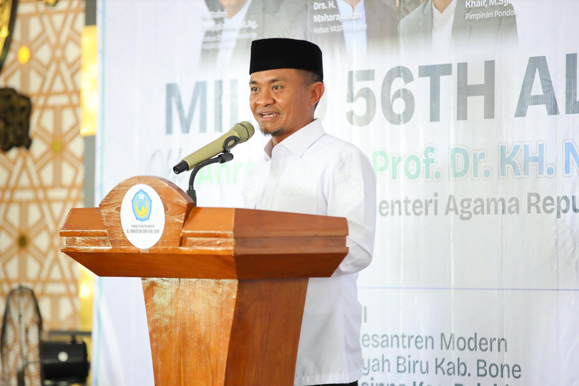 Dalam sambutannya, Bupati Bone menyampaikan apresiasi dan penghargaan atas kiprah Pondok Pesantren Modern Al-Junaidiyah Biru yang telah berkontribusi selama 56 tahun dalam mencetak generasi yang berilmu, berakhlak mulia, dan berdaya saing. Menurutnya, pesantren memiliki peran strategis dalam membangun sumber daya manusia yang tidak hanya unggul secara intelektual, tetapi juga kokoh secara moral dan spiritual.