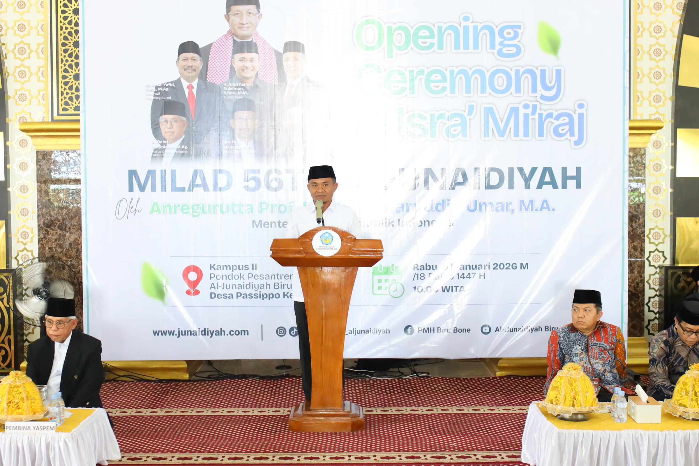 Kegiatan yang berlangsung khidmat tersebut dilaksanakan di Kampus I Pondok Pesantren Modern Al-Junaidiyah Biru, Desa Passippo, Kecamatan Palakka, Kabupaten Bone. Acara dibuka secara resmi oleh Anregurutta Prof. Dr. KH. Nasaruddin Umar, M.A., Menteri Agama Republik Indonesia, yang juga menyampaikan tausiyah dalam rangka peringatan Isra Mi’raj Nabi Muhammad SAW.