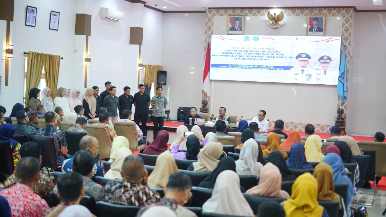 Kegiatan evaluasi tersebut berlangsung di Baruga La Teya Ri Duni, Kompleks Rumah Jabatan Bupati Bone. Evaluasi ini dilaksanakan sebagai upaya memperkuat koordinasi lintas sektor dalam percepatan penurunan angka kemiskinan dan stunting di Kabupaten Bone berbasis data yang akurat dan terintegrasi.