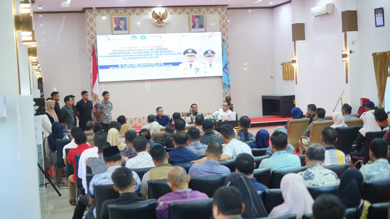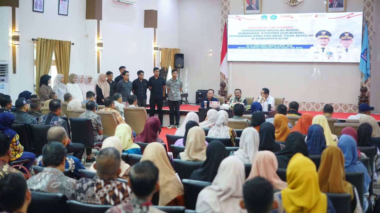 Kegiatan evaluasi tersebut berlangsung di Baruga La Teya Ri Duni, Kompleks Rumah Jabatan Bupati Bone. Evaluasi ini dilaksanakan sebagai upaya memperkuat koordinasi lintas sektor dalam percepatan penurunan angka kemiskinan dan stunting di Kabupaten Bone berbasis data yang akurat dan terintegrasi.