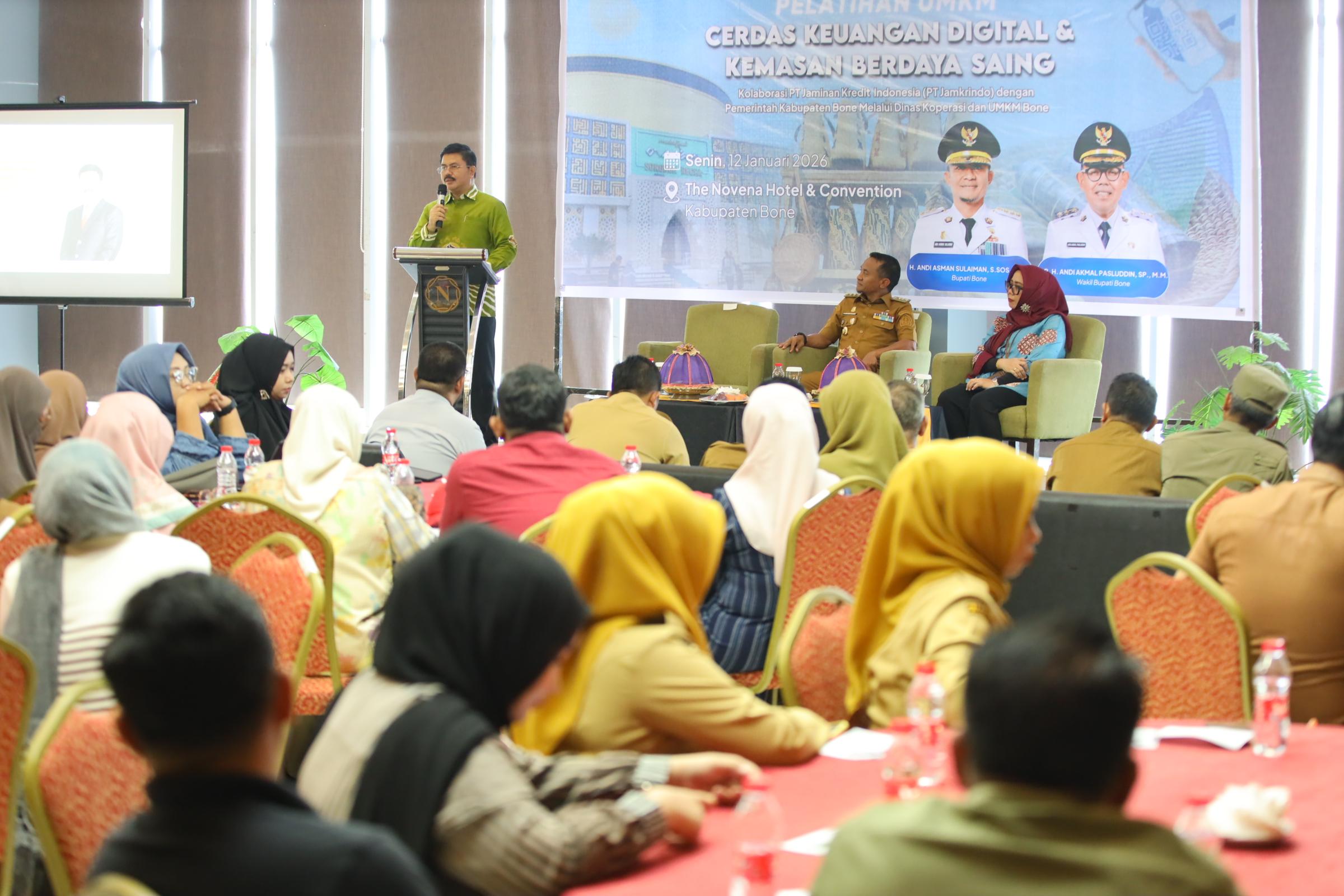HumasBone – Bupati Bone, H. Andi Asman Sulaiman, secara resmi membuka kegiatan Pelatihan UMKM Cerdas Keuangan Digital dan Kemasan Berdaya Saing yang berlangsung di Hotel Novena, Jalan A. Yani, Senin (12/1/2026). Kegiatan ini merupakan hasil kolaborasi antara PT Jaminan Kredit Indonesia (Jamkrindo) dengan Pemerintah Kabupaten Bone melalui Dinas Koperasi dan UMKM Kabupaten Bone.