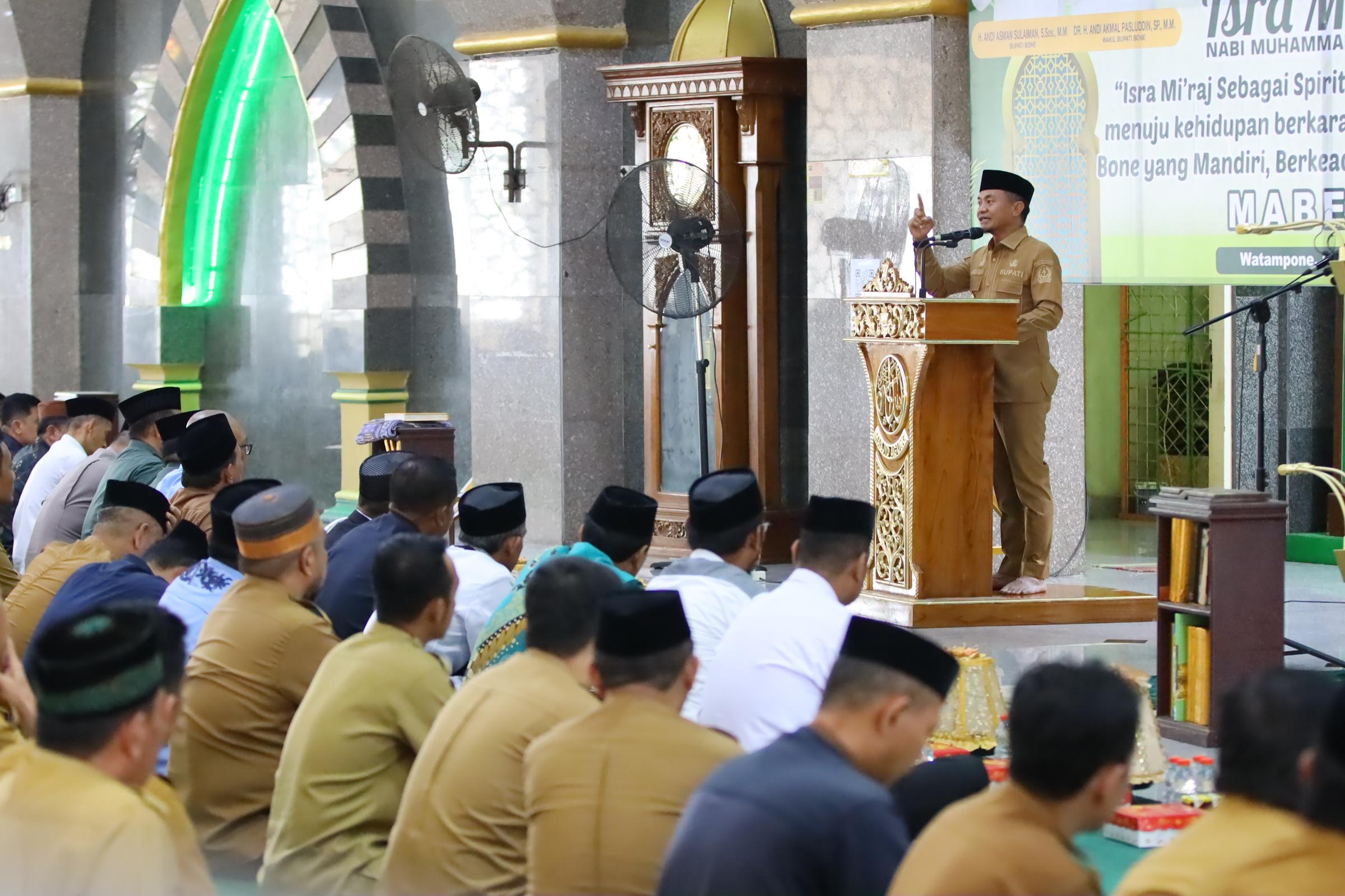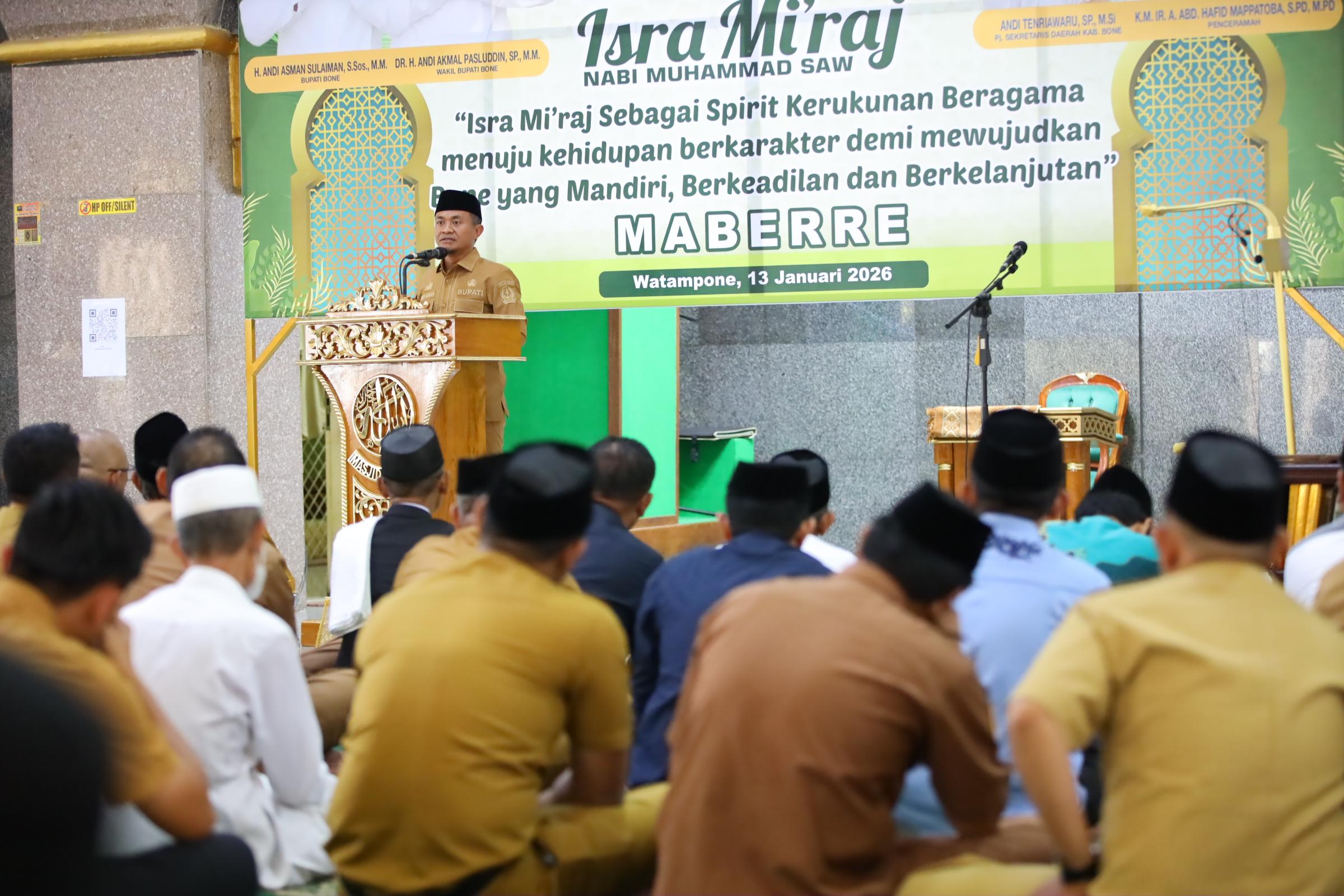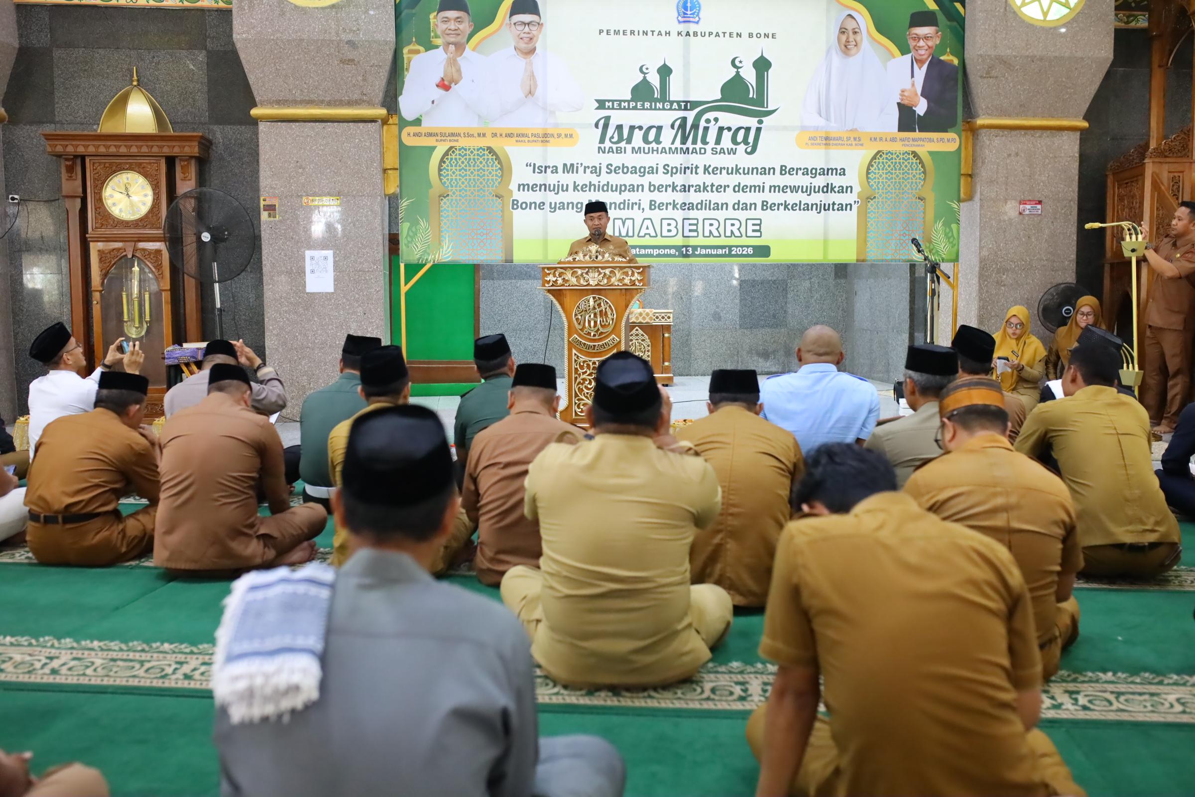 HumasBone — Pemerintah Kabupaten Bone memperingati Isra Mi’raj Nabi Muhammad SAW dengan mengusung tema “Isra Mi’raj sebagai Spirit Kerukunan Beragama Menuju Kehidupan Berkarakter demi Mewujudkan Bone yang Mandiri, Berkeadilan, dan Berkelanjutan.” Kegiatan ini berlangsung khidmat dan dihadiri oleh jajaran pimpinan serta aparatur Pemerintah Kabupaten Bone.