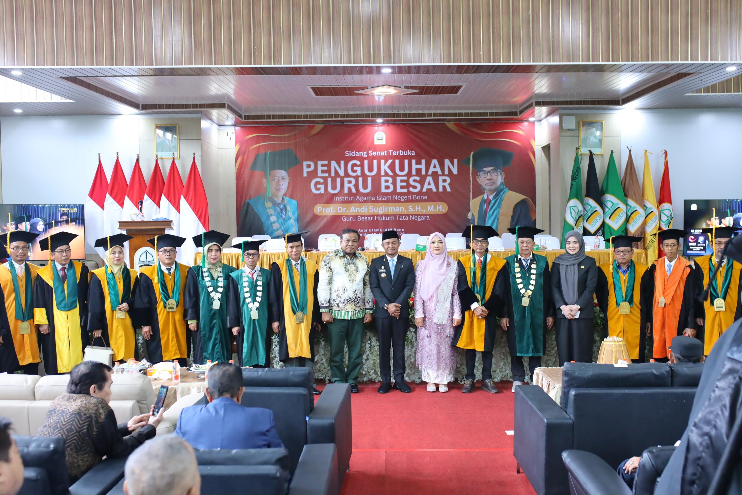HumasBone – Bupati Bone, H. Andi Asman Sulaiman, S.Sos., M.M., menghadiri pengukuhan Prof. Dr. Andi Sugirman, S.H., M.H., sebagai Guru Besar Hukum Tata Negara Institut Agama Islam Negeri (IAIN) Bone. Acara ini berlangsung di Aula Utama IAIN Bone.