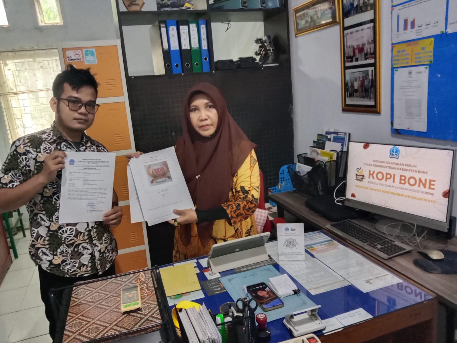 Pada Jumat (23/1), KOPI BONE melaksanakan tiga kegiatan, yakni penerimaan dokumen pengurusan HKI Merek Pabrik Beras Lallere’e, koordinasi promosi produk IKM di Bandara Arung Palakka, serta penyerahan Sertifikat Halal gratis kepada Catering Massengereng di Macanang.