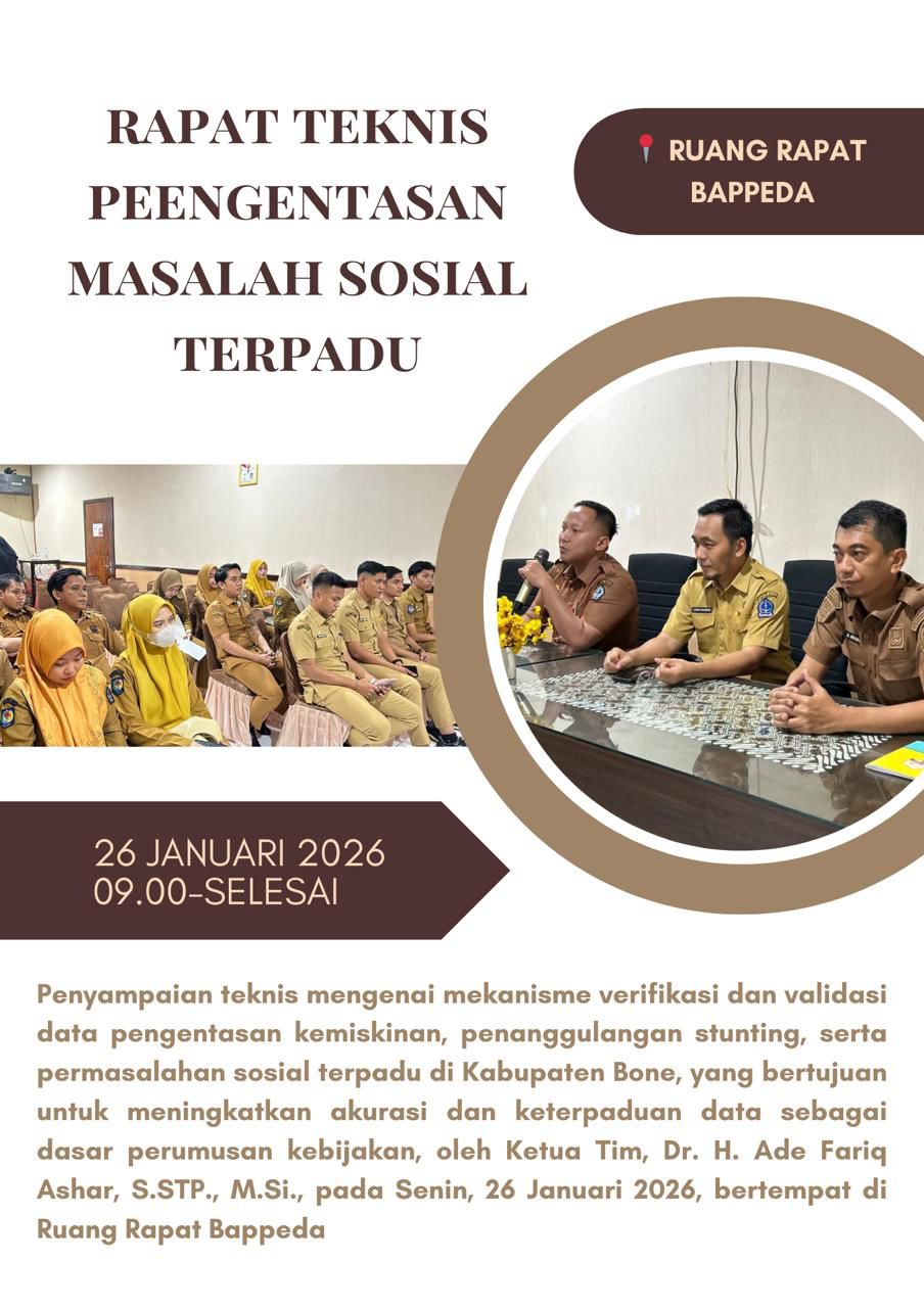 HumasBone – Pemerintah Kabupaten Bone melalui Badan Perencanaan dan Pembangunan Daerah menggelar Rapat Teknis Pengentasan Masalah Sosial Terpadu yang berlangsung di Ruang Rapat Bappeda, Senin (26/1/2026), pukul 09.00 WITA hingga selesai.