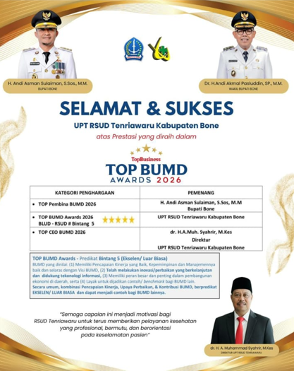 Pada ajang yang sama, Bupati Bone H. Andi Asman Sulaiman, S.Sos., M.M., menerima penghargaan sebagai TOP Pembina BUMD 2026 atas komitmen dan perannya dalam mendorong peningkatan kinerja BUMD di Kabupaten Bone. Sementara itu, Direktur RSUD Tenriawaru dr. H.A. Muh. Syahrir, M.Kes., dianugerahi penghargaan TOP CEO BUMD 2026 atas kepemimpinan dan inovasinya dalam pengelolaan rumah sakit.