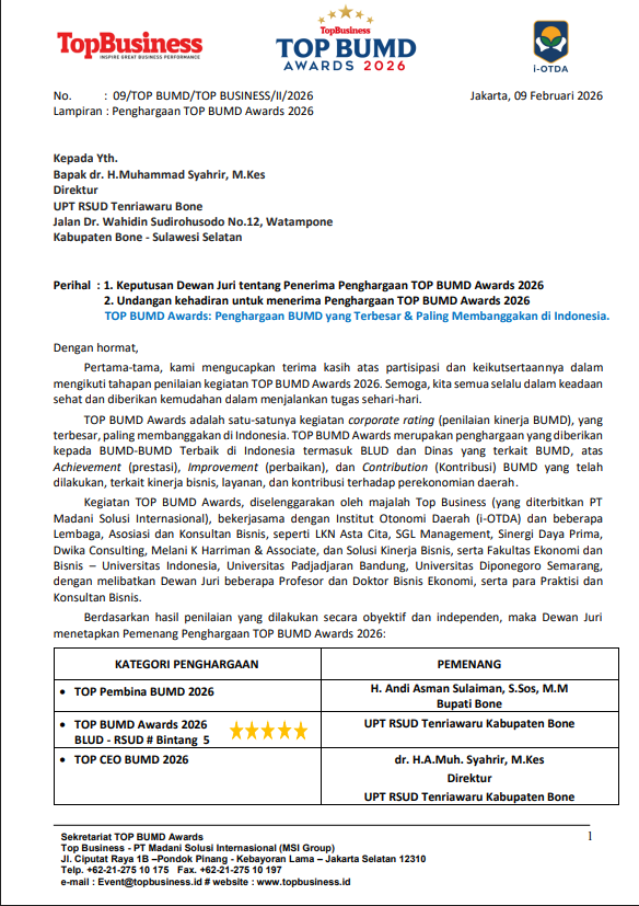 HumasBone – Prestasi membanggakan kembali ditorehkan Kabupaten Bone melalui UPT RSUD Tenriawaru yang berhasil meraih penghargaan TOP BUMD Awards 2026 Bintang 5 dalam ajang nasional yang diselenggarakan oleh TopBusiness. Penghargaan ini merupakan bentuk pengakuan atas kinerja, tata kelola, serta inovasi pelayanan yang terus dikembangkan RSUD Tenriawaru dalam menghadirkan layanan kesehatan yang profesional dan berstandar tinggi.
