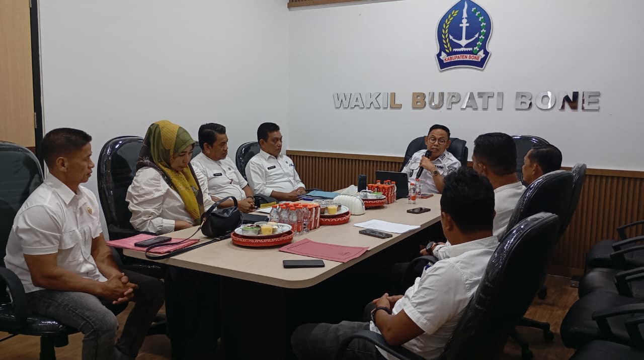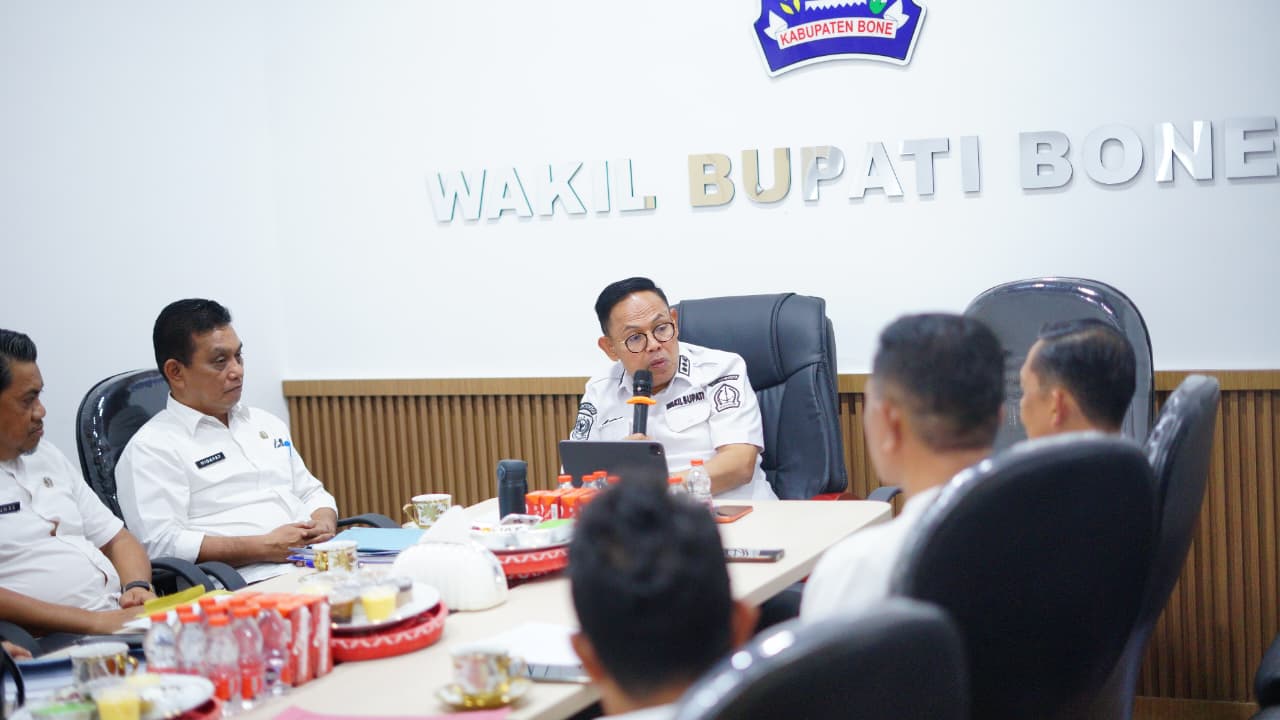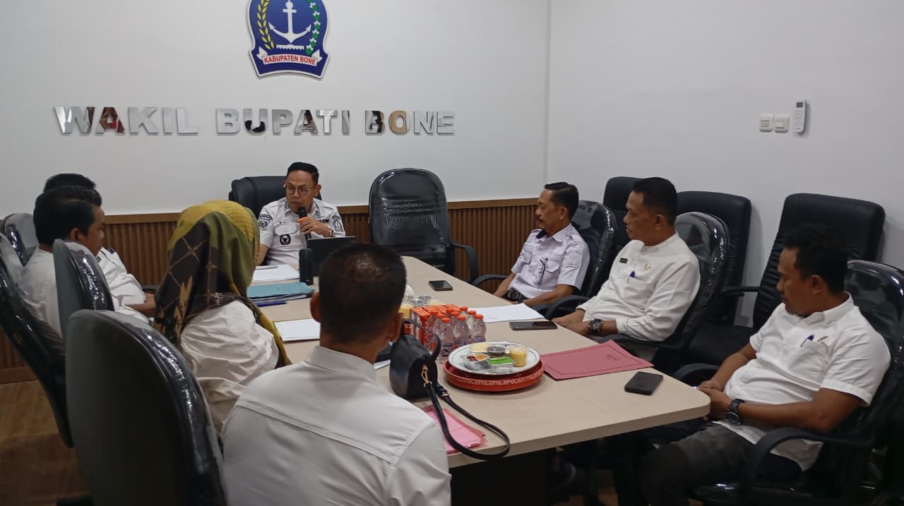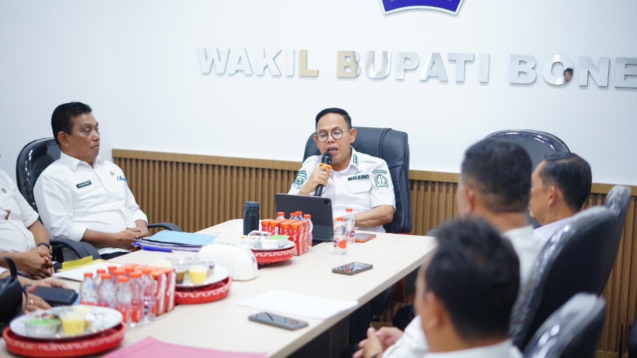 HumasBone – Wakil Bupati Bone, Dr. H. Andi Akmal Pasluddin, S.P., M.M., memimpin pertemuan bersama Kepala Dinas Perdagangan Kabupaten Bone, Muhammad Rusdi, S.Pd., M.Pd., beserta jajaran dalam rangka evaluasi dan penguatan komitmen peningkatan kepatuhan pembayaran retribusi pasar. Pertemuan tersebut berlangsung di Ruang Rapat Wakil Bupati Bone, Rabu, 11 Februari 2026.