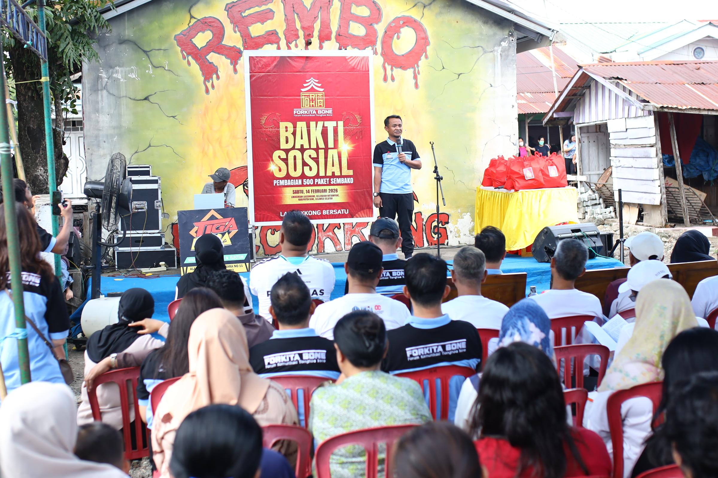 HumasBone – Bupati Bone Andi Asman Sulaiman, S.Sos., M.Si., didampingi Ketua TP PKK Kabupaten Bone Hj. Maryam Andi Asman, bersama Wakil Bupati Bone Andi Akmal Pasluddin yang didampingi Wakil Ketua TP PKK Ibu Hj. Maya Damayanti Andi Akmal, menghadiri kegiatan bakti sosial yang diselenggarakan oleh Forum Komunitas Tionghoa Bone (FORKITA), Sabtu, 14 Februari 2026.
