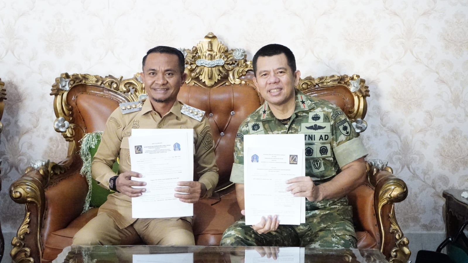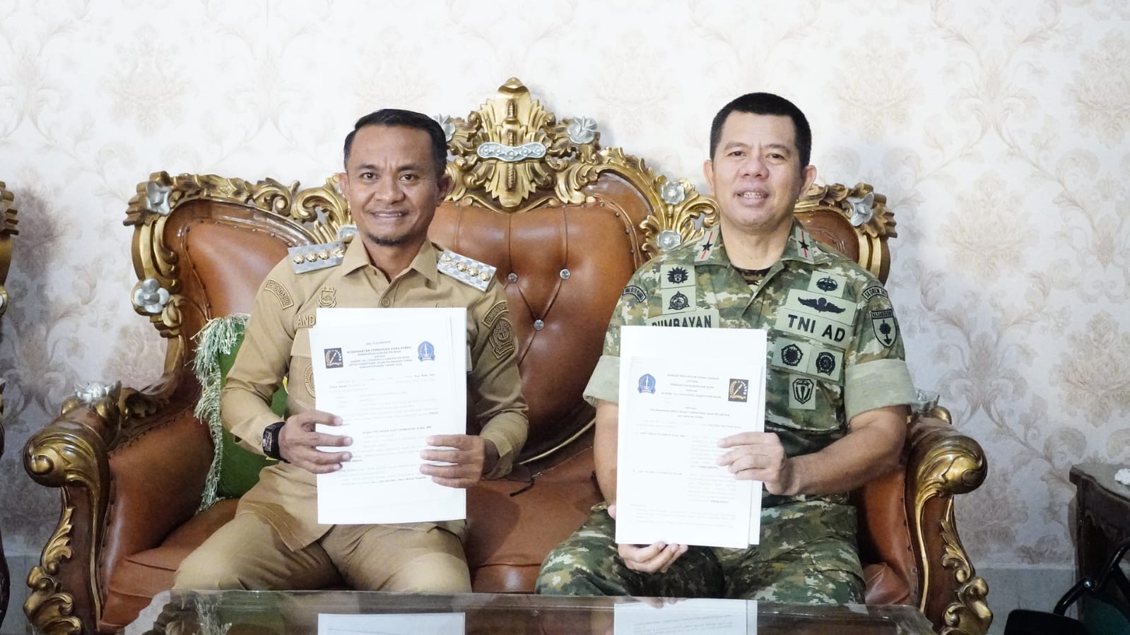 HumasBone – Bupati Bone, Andi Asman Sulaiman, S.Sos., M.M., menandatangani Naskah Hibah bersama Komandan Komando Resor Militer 141/Toddopuli, Brigjen TNI Andre Clift Rumbayan, S.Sos., M.M., di Rumah Jabatan Danrem, Jalan Petta Ponggawae, Selasa, 24 Februari 2026.