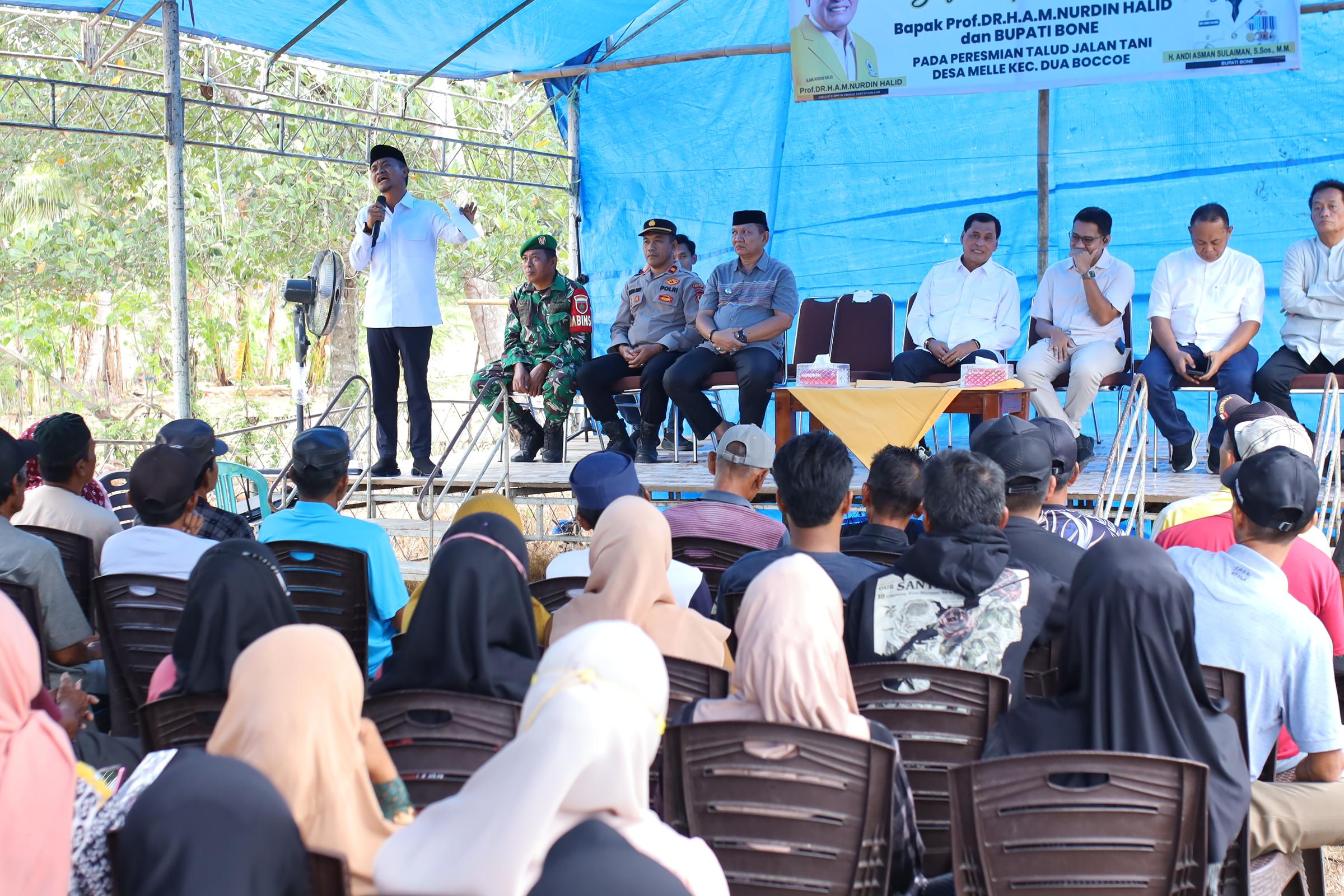 – Bupati Bone Andi Asman Sulaiman, S.Sos., M.M., mendampingi Anggota DPR RI Nurdin Halid yang juga Wakil Ketua Komisi VI DPR RI meresmikan pembangunan talud jalan tani di Desa Melle, Kecamatan Dua Boccoe, Ahad (8/3/2026).
