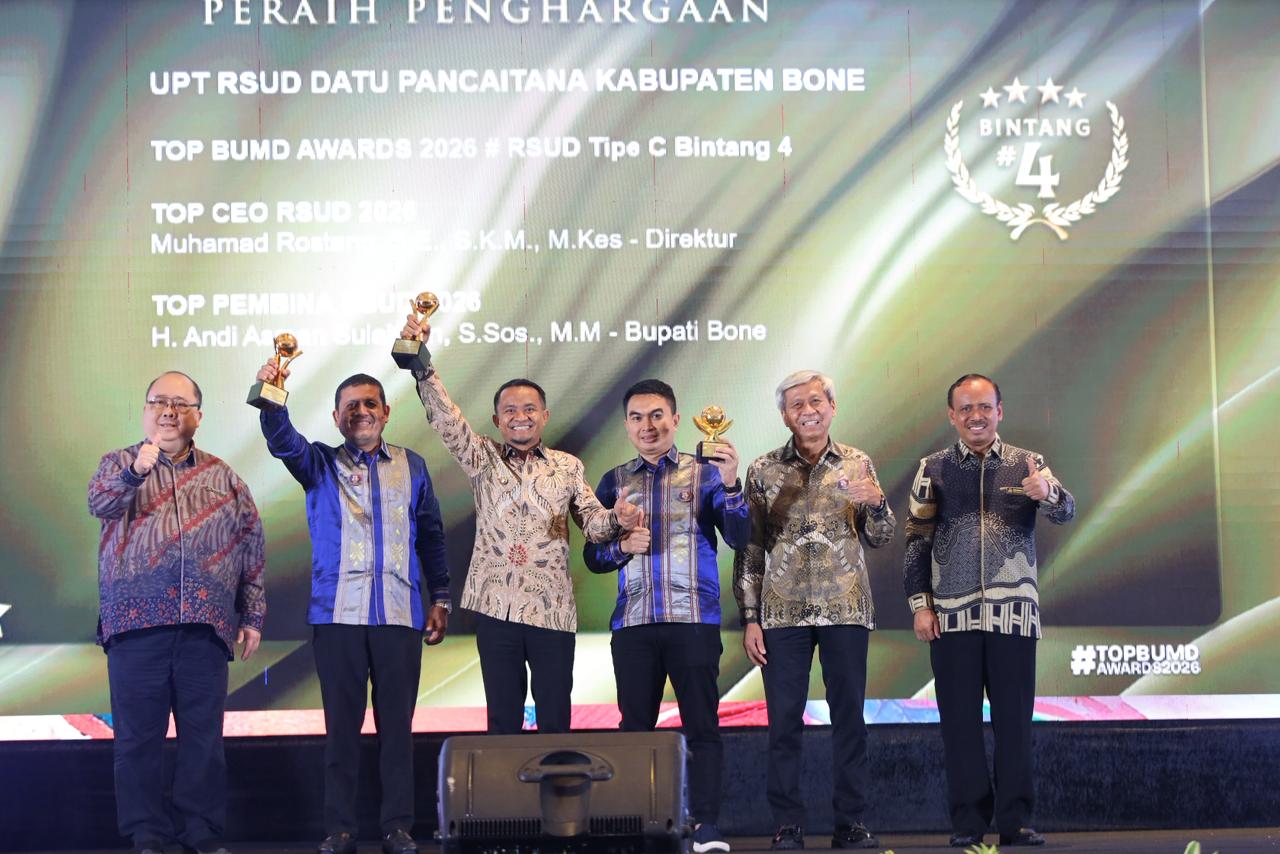 Sementara itu, RSUD Datu Pancaitana juga meraih 3 penghargaan, yaitu Top BUMD Awards 2026 BLUD-RSUD Bintang 4, Top CEO RSUD 2026 yang diberikan kepada H. Muhammad Rostang, SKM., M.Kes, dan Top Pembina RSUD 2026 yang diberikan kepada Bupati Bone, Andi Asman Sulaiman, S.Sos, MM.