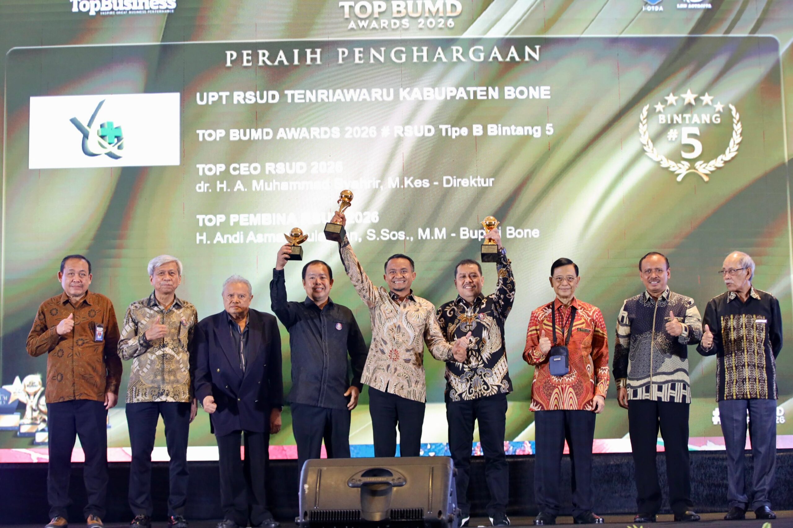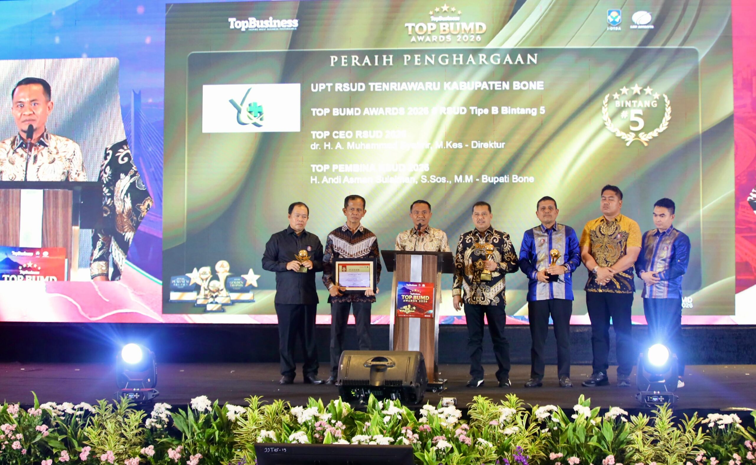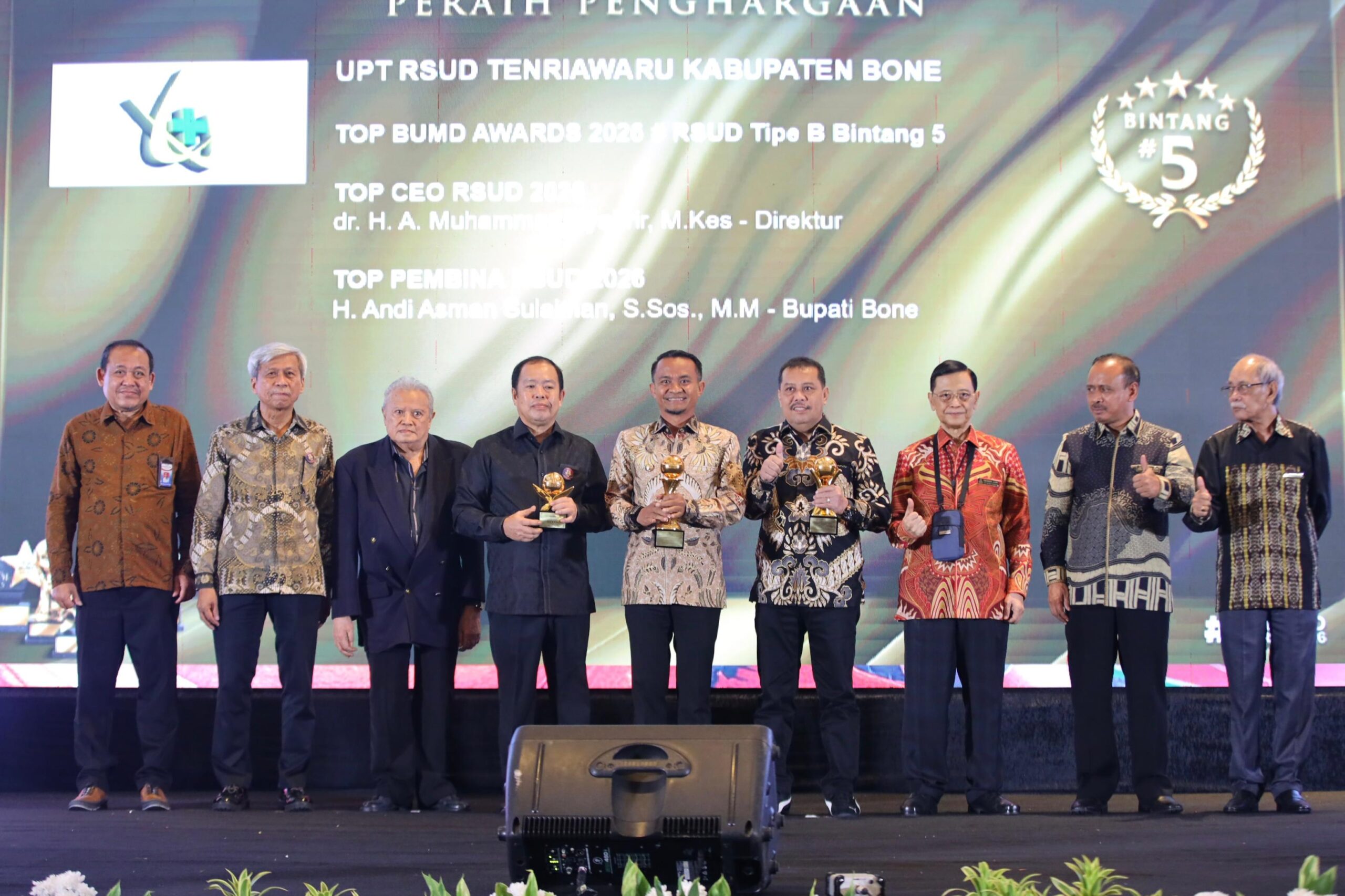 RSUD Tenriawaru Bone menyabet 3 penghargaan, yaitu Top BUMD Awards 2026 RSUD Tipe B Bintang 5, Top CEO BUMD 2026 yang diberikan kepada Direktur RSUD Tenriawaru, dr. H. Muh. Syahrir, M.Kes, dan Top Pembina RSUD 2026 yang diberikan kepada Bupati Bone, Andi Asman Sulaiman, S.Sos, MM.