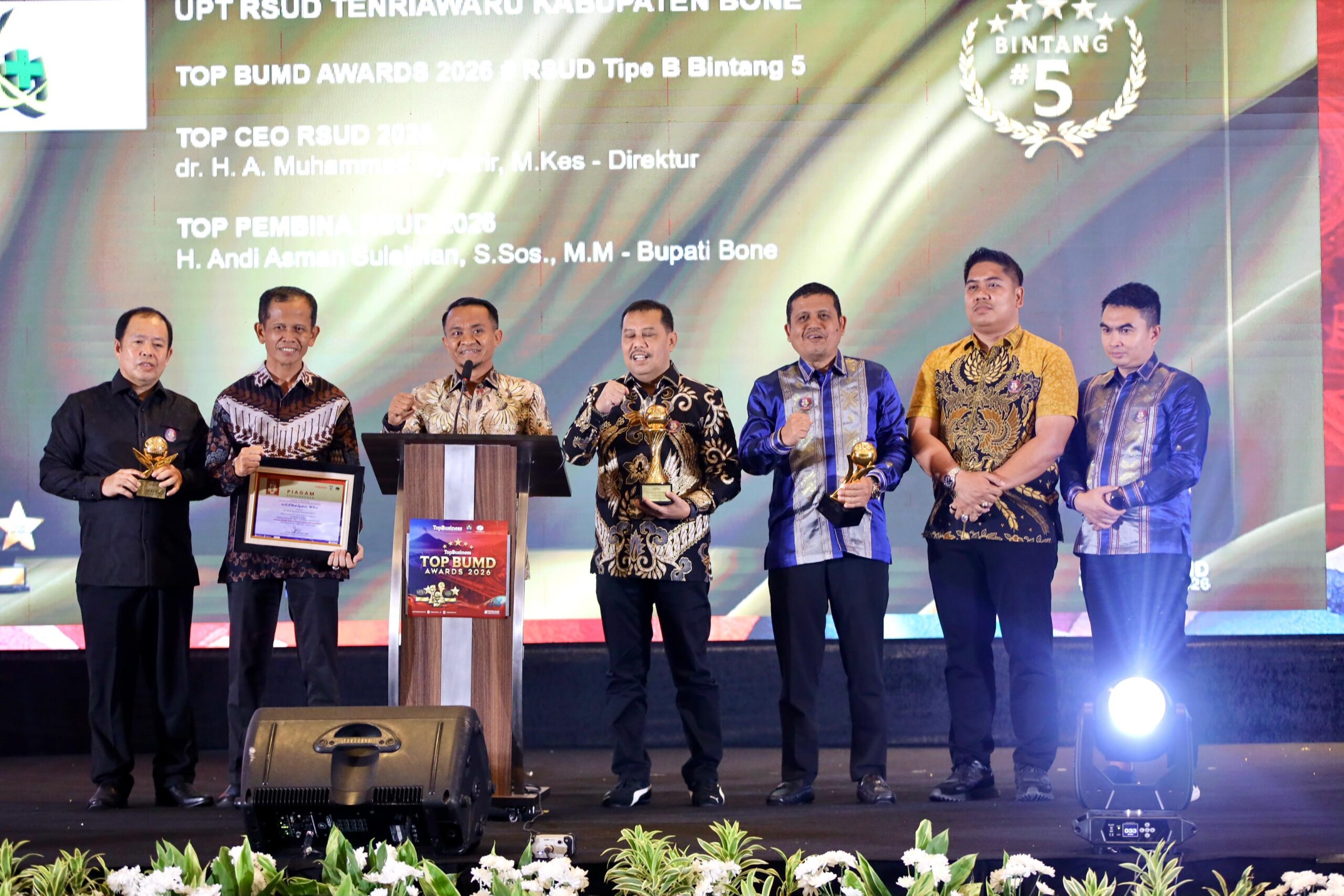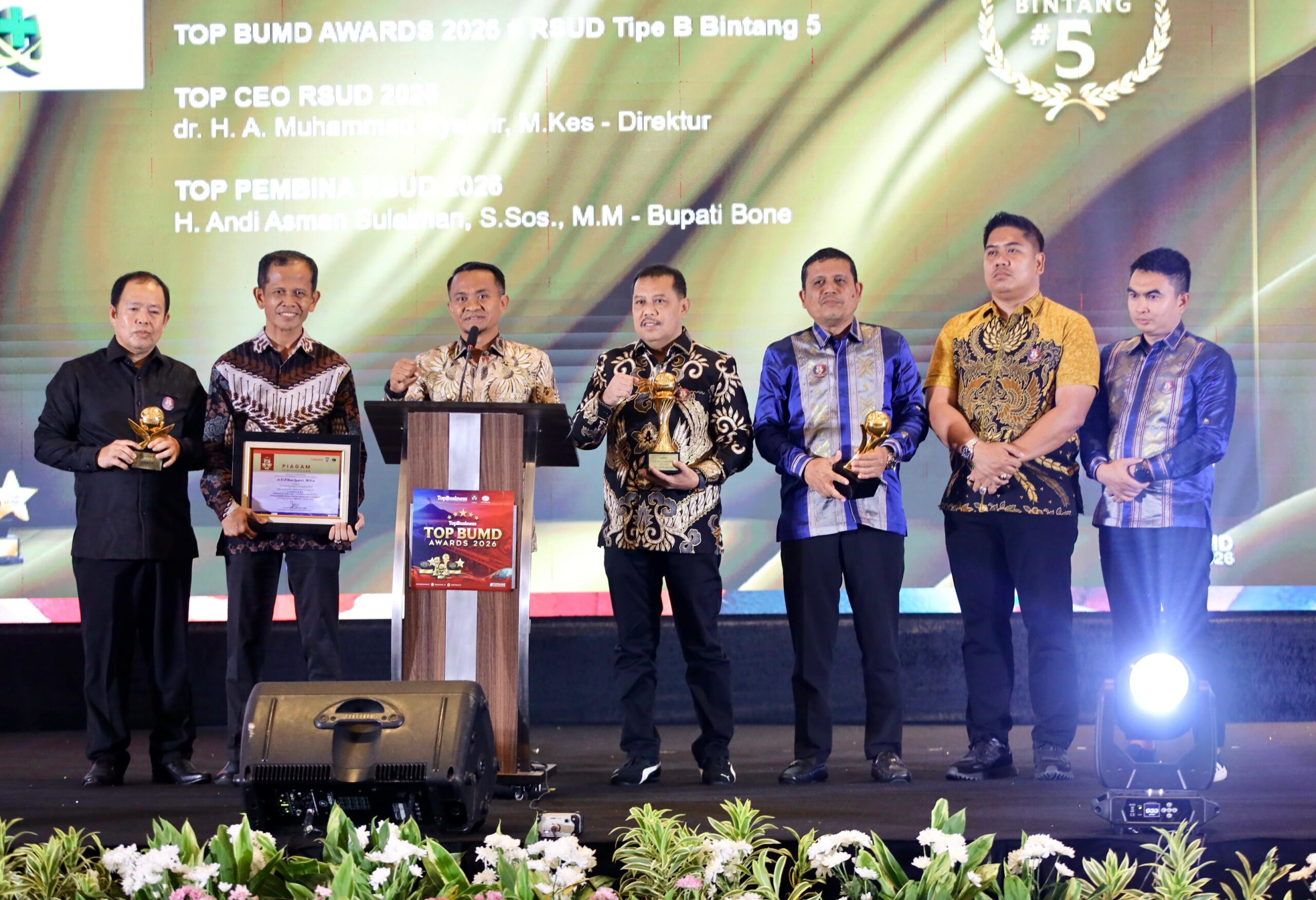 Sementara itu, RSUD Datu Pancaitana juga meraih 3 penghargaan, yaitu Top BUMD Awards 2026 BLUD-RSUD Bintang 4, Top CEO RSUD 2026 yang diberikan kepada H. Muhammad Rostang, SKM., M.Kes, dan Top Pembina RSUD 2026 yang diberikan kepada Bupati Bone, Andi Asman Sulaiman, S.Sos, MM.