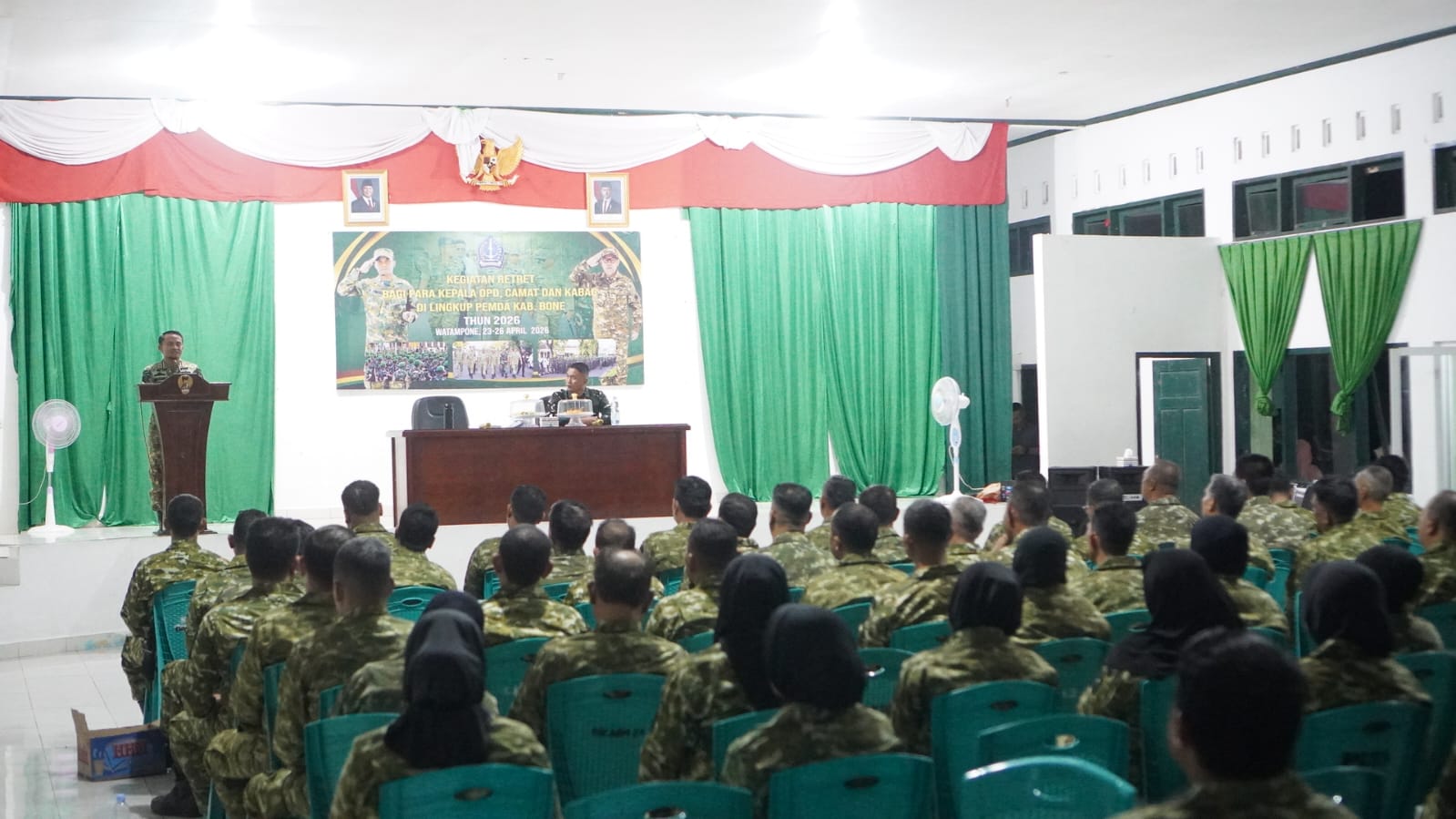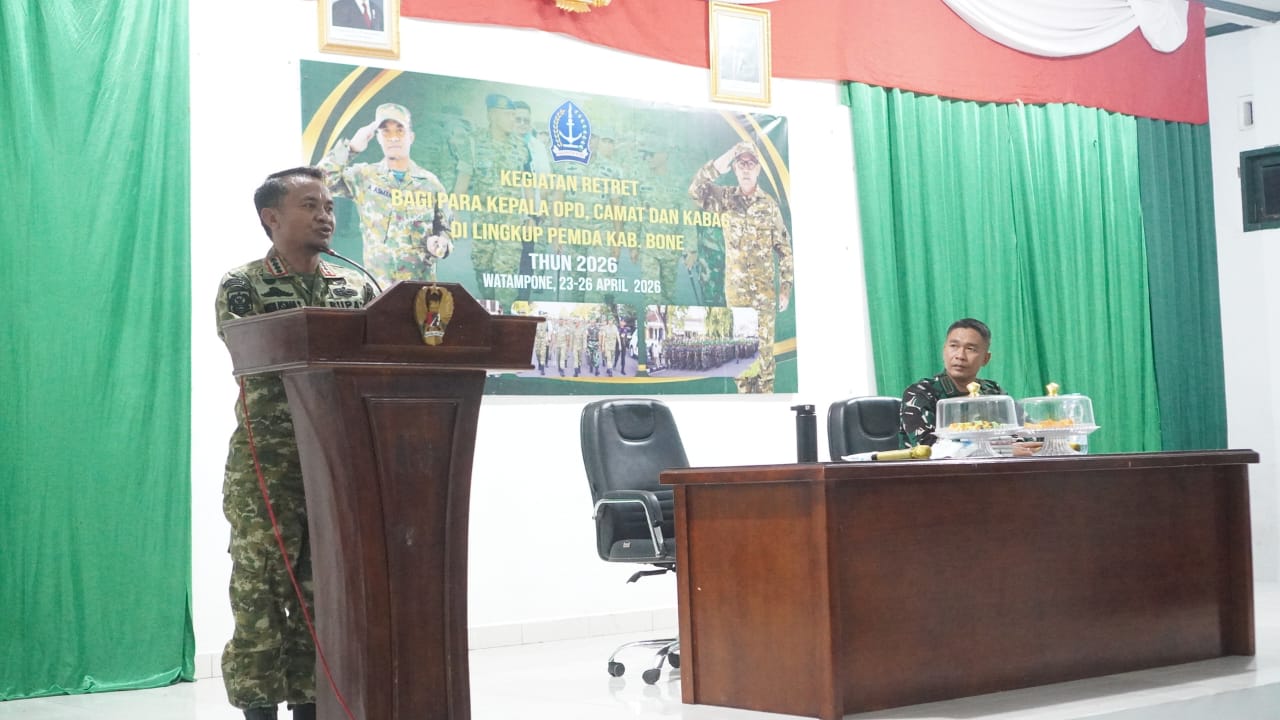 HumasBone – Bupati Bone, H. Andi Asman Sulaiman, S.Sos., M.M., memberikan pengarahan kepada peserta retret yang dilaksanakan di Batalyon Armed 21/Kawali, Kecamatan Bengo, Kamis (23/4/2026).