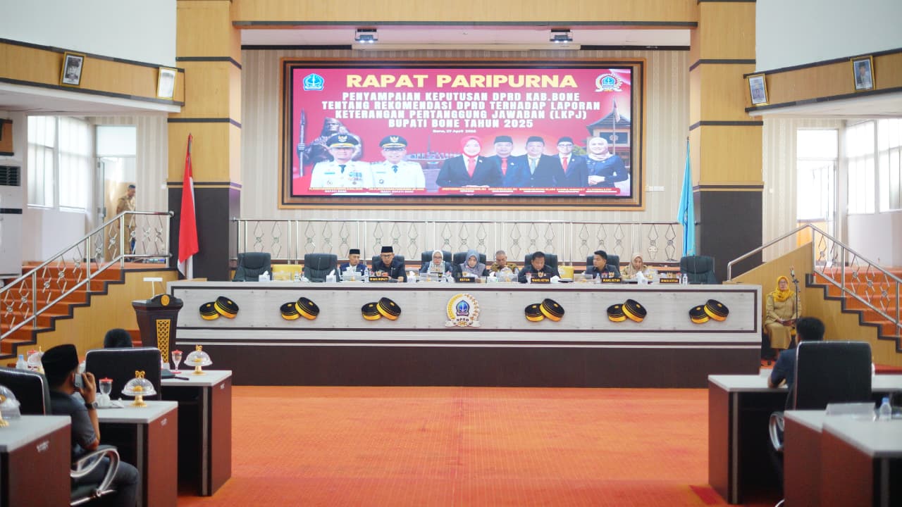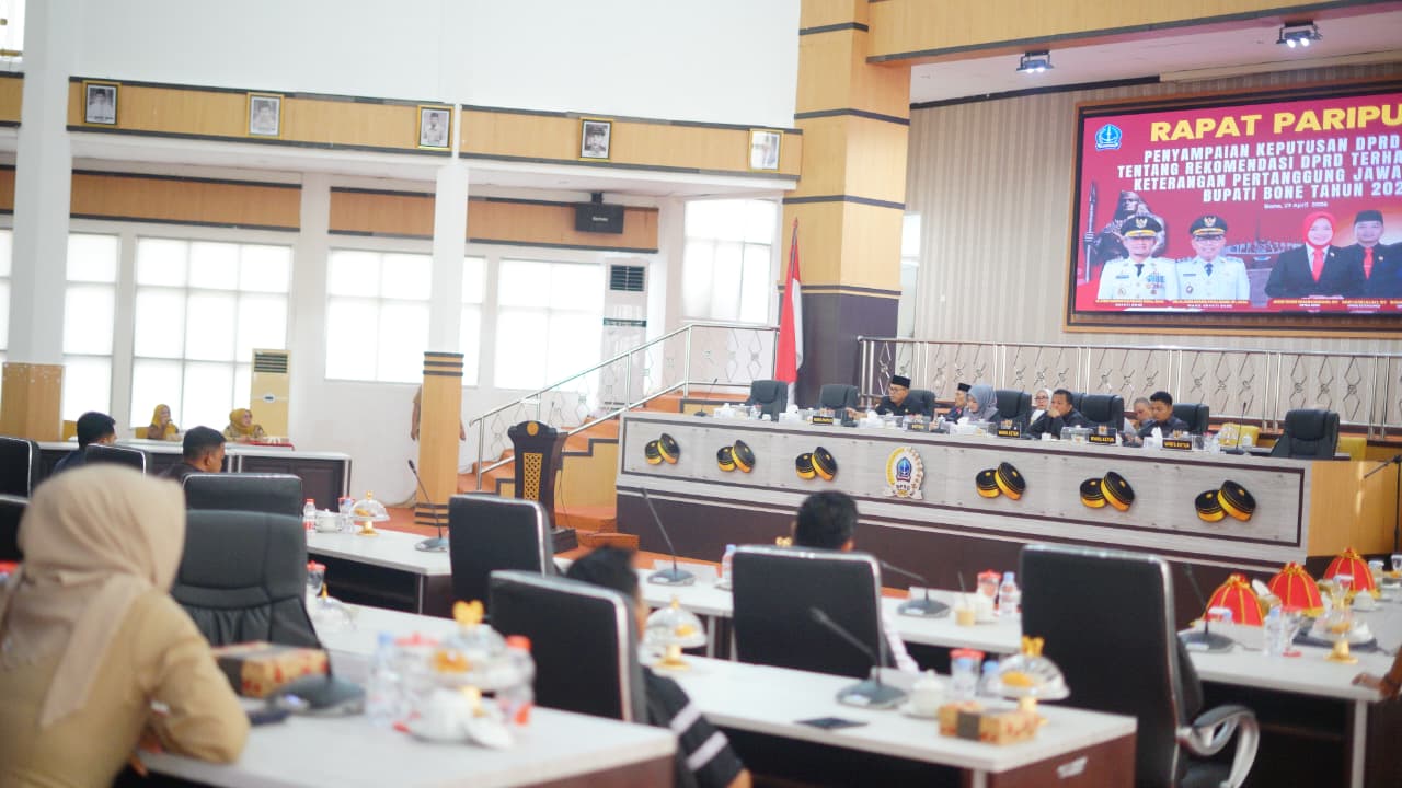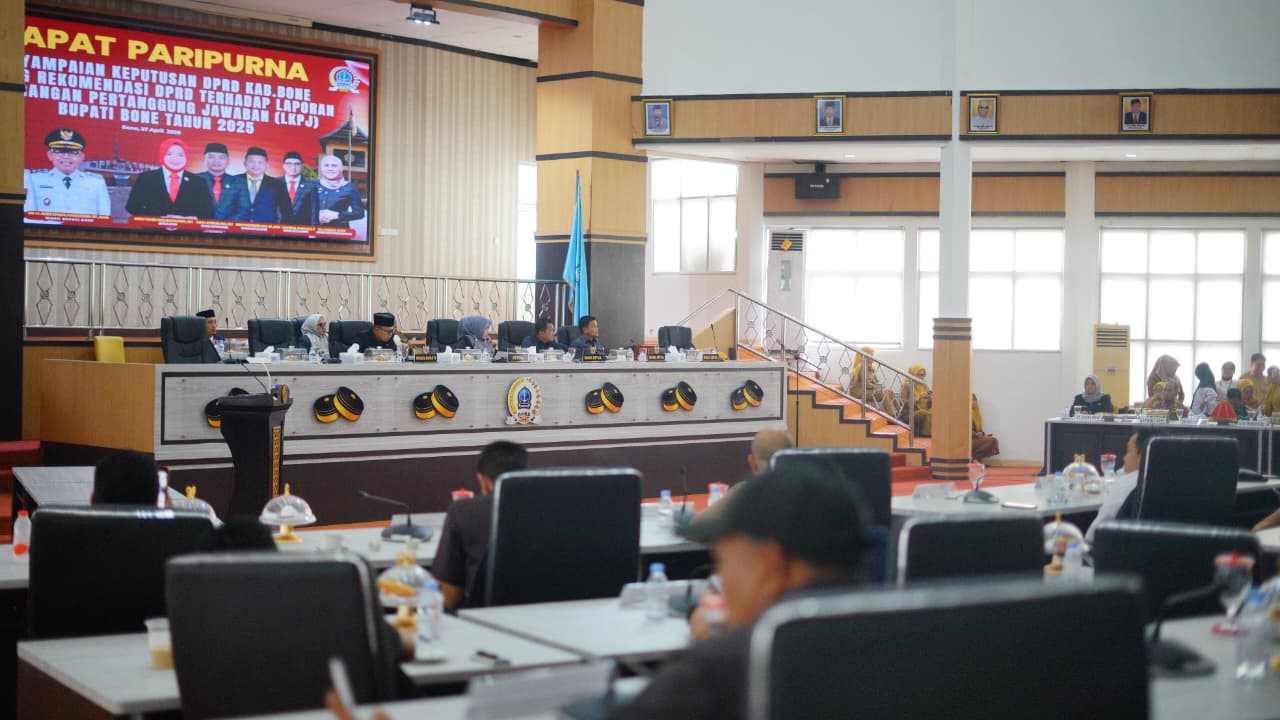 Rapat berlangsung di Gedung Paripurna DPRD Kabupaten Bone dengan agenda utama penyampaian keputusan DPRD Kabupaten Bone terkait rekomendasi terhadap Laporan Keterangan Pertanggungjawaban (LKPJ) Bupati Bone Tahun Anggaran 2025.