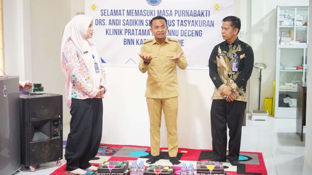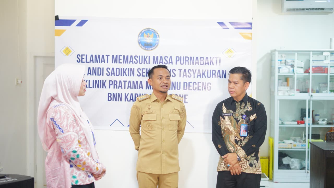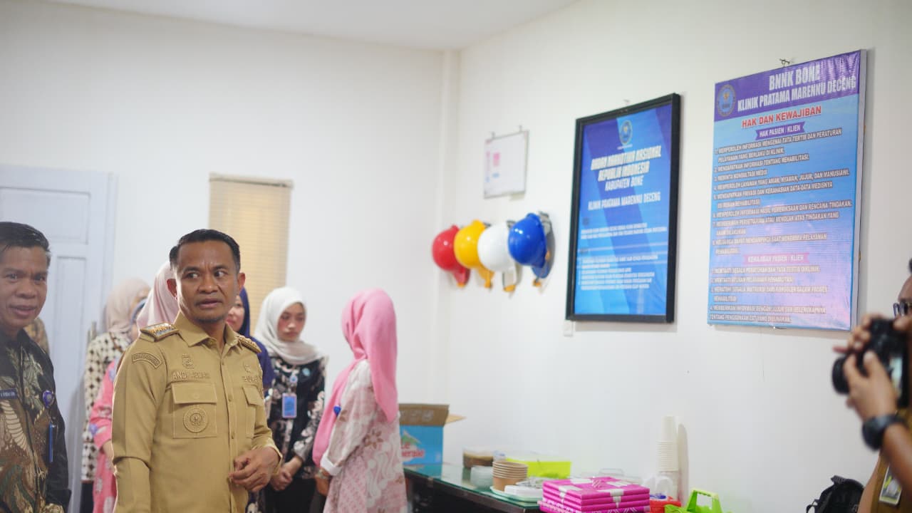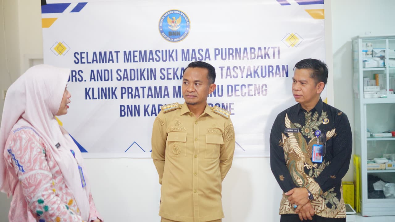 HumasBone – Bupati Bone, H. Andi Asman Sulaiman, S.Sos., M.M., melaksanakan kunjungan kerja ke Badan Narkotika Nasional Kabupaten (BNNK) Bone di Klinik Pratama Marennu Deceng, Jalan Kompleks Stadion Lapatau, Kelurahan Macanang, Kecamatan Tanete Riattang Barat, Selasa (28/4/2026). Kunjungan tersebut dirangkaikan dengan tasyakuran Klinik Pratama Marennu Deceng sekaligus momentum purnabakti Kasubag Umum BNNK Bone, Drs. Andi Sadikin.